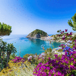 A view of SantAngelo in Ischia island in Italy: Tyrrhenian sea bougaiunvillea glabra rocks water umbrella sand and old typical houses in the island in front of Naples in Campania region in a sunny day