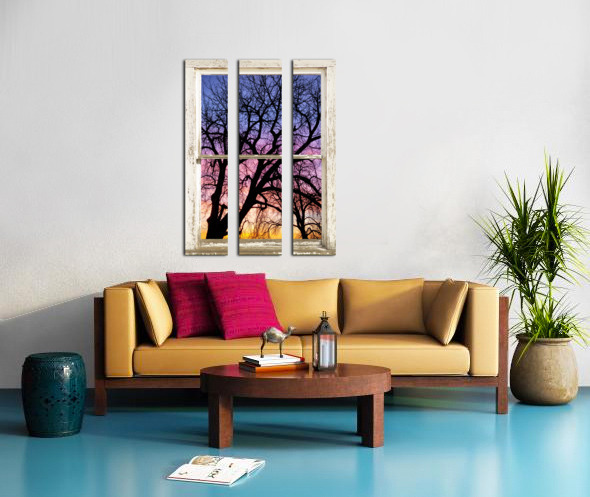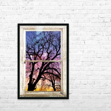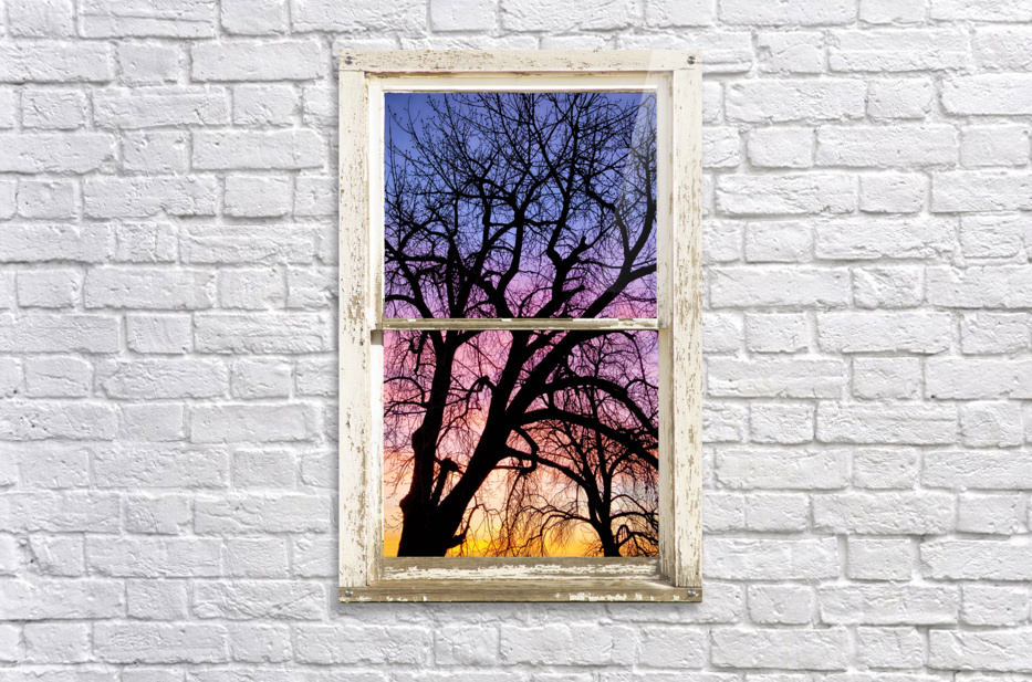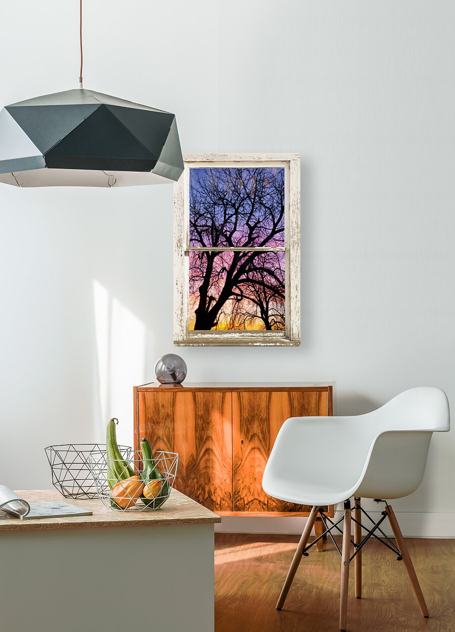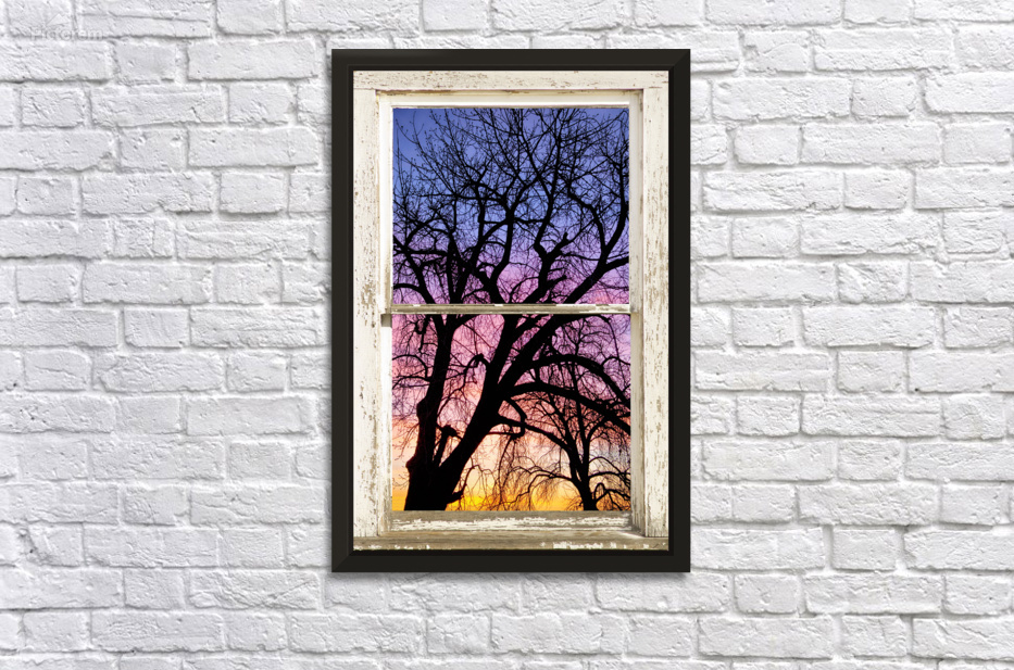 Portrait view of an early morning colorful sunrise behind a silhouetted tree through a white peeling rustic farm house picture window frame. Your very own private window view into the beautiful rocky mountains autumn forest. Bring nature indoors now you can add a window with a view to any room in your home or office with our picture window frame fine art striking photography nature landscape art prints. The IMAGE is the FRAME how cool is that! PLEASE NOTE : The Window Frame is part of the image. Question: Do you have a home or office room without any windows? Do you want to set the mood in a room decor? Do you dream of a room with a view? The Answer: Now you can have a window with a view in any room with our NEW picture window frame fine art striking photography nature landscape poster prints canvas wraps acrylic fine art prints and metal prints all with a view and ready to hang by photographer James Bo Insogna C All Rights Reserved. This is an incredible way to decorate your office walls home walls cafe restaurant boardroom waiting room trade booth corporation or almost any commercial space. Colorado Fine art nature landscape photography poster prints decorative canvas prints acrylic prints metal prints corporate artwork greeting cards and stock images by James Bo Insogna C ? All Rights Reserved. *PLEASE NOTE WATERMARKS WILL NOT BE ON THE PURCHASE PRINTS*