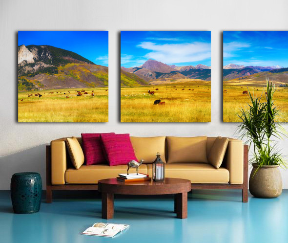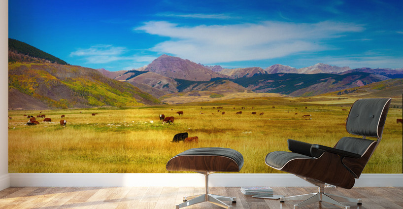 A very large panorama scenic view of cattle grazing with the Rocky Mountains in the background and a splash of autumn colors. Crested Butte Colorado Gunnison County. Colorado Fine art photography prints decorative canvas prints acrylic prints and metal prints by By James Bo Insogna C - All Rights Reserved. *PLEASE NOTE WATERMARKS WILL NOT BE ON THE PURCHASE PRINTS*