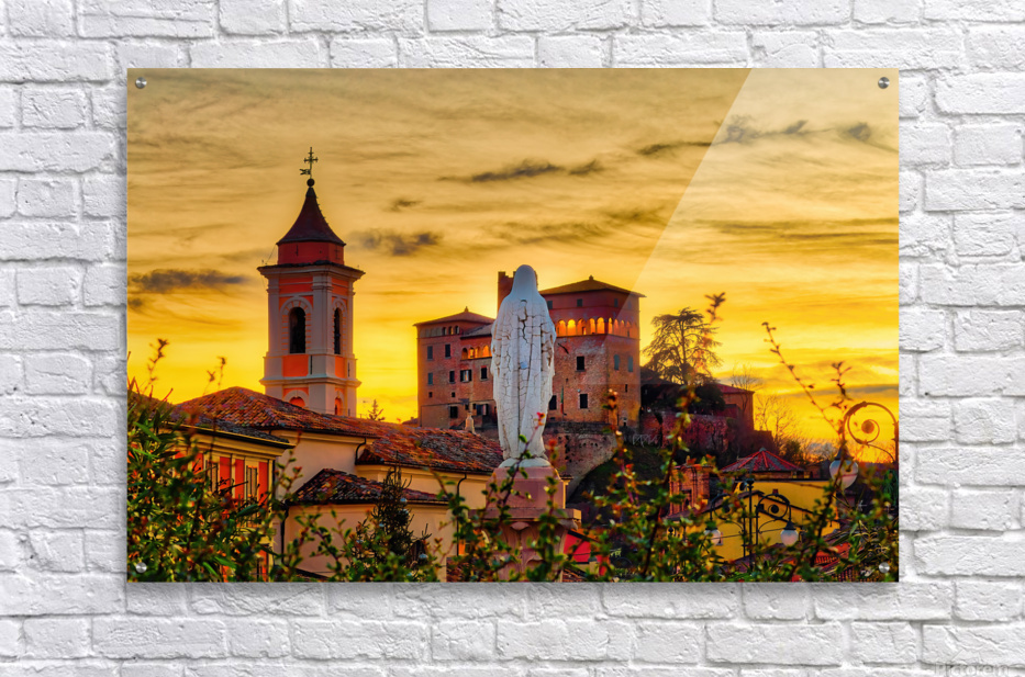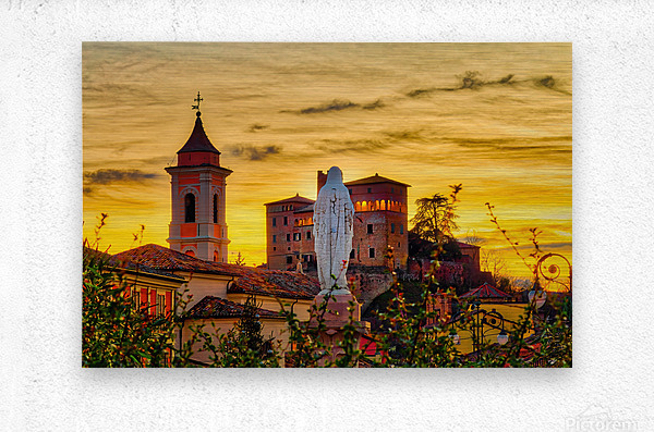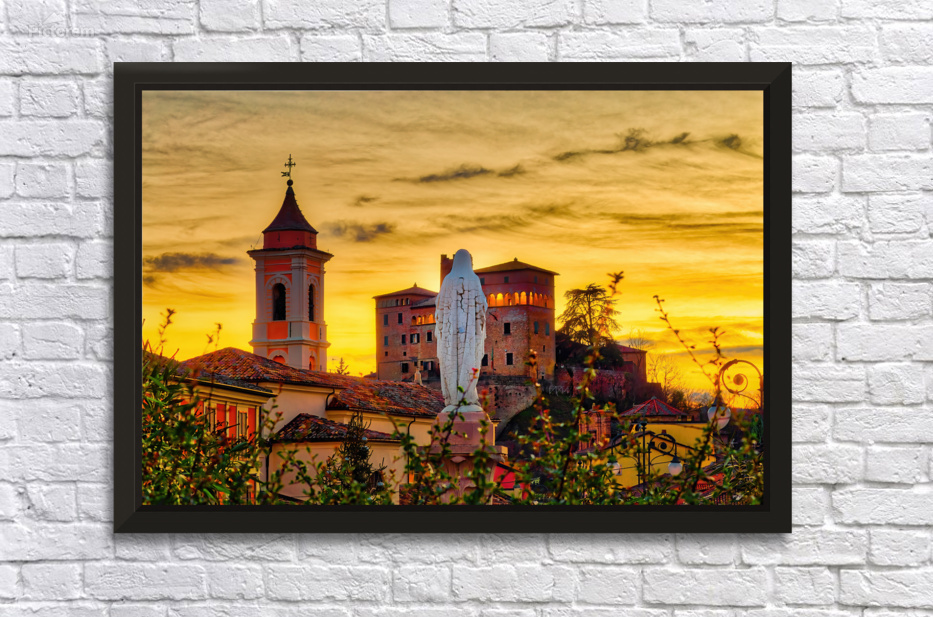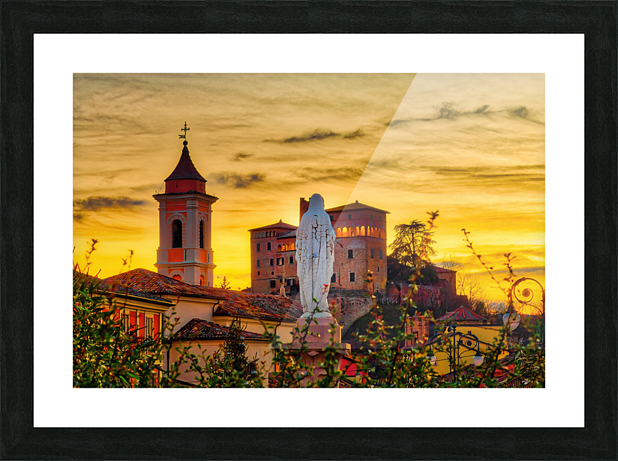 winter sunset on the statue ot the Blessed Virgin Mary looking at medieval castle in Italian medieval village - FineArtPhoto