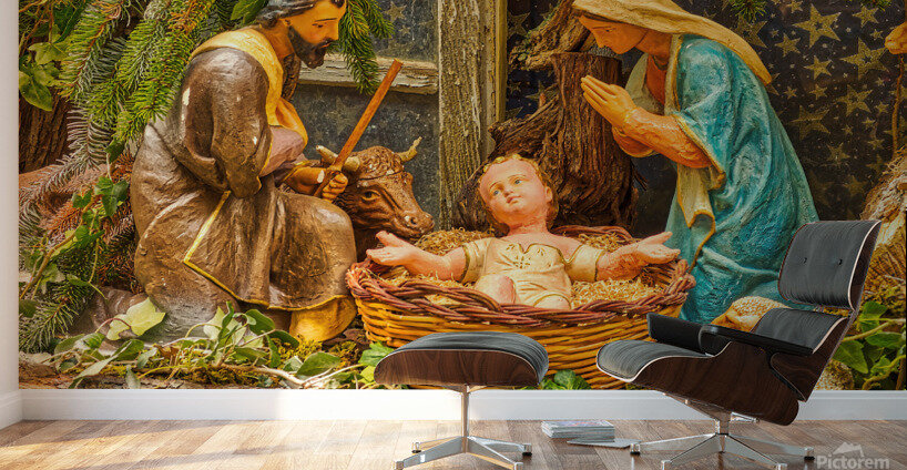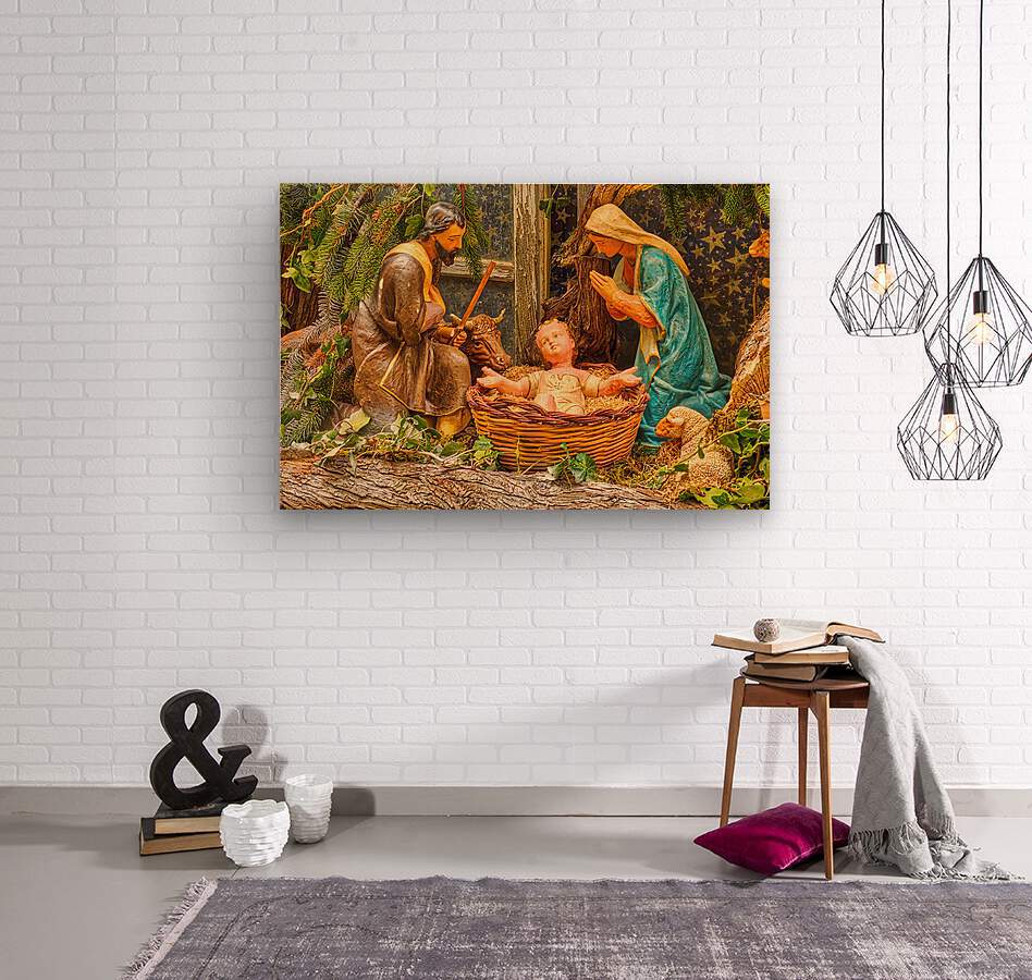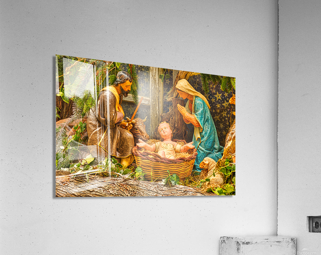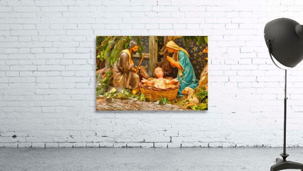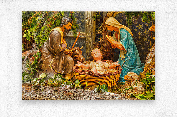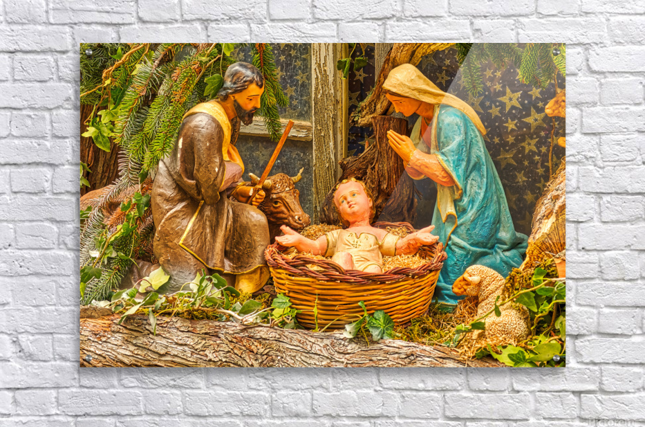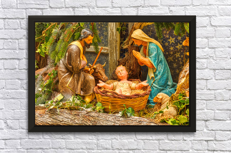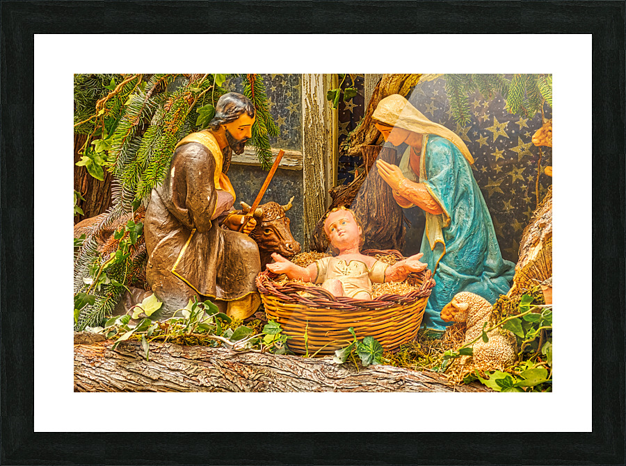 Christmas Nativity scene with The Holy Child The Blessed Virgin Mary Saint Joseph ox and donkey - FineArtPhoto