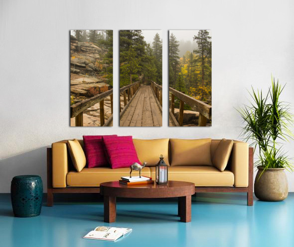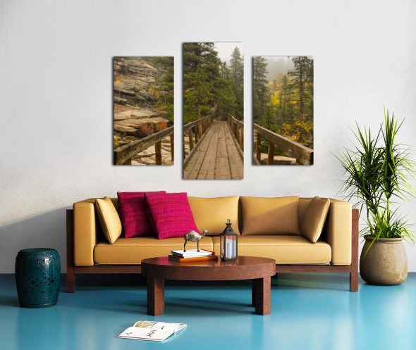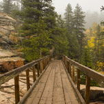 Cropped version up tp 48x36 of cool rustic wooden hiking bridge crossing over St St Vrain Creek into the low clouds. A nice place to take a walk in t...[+]