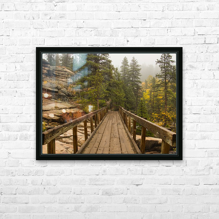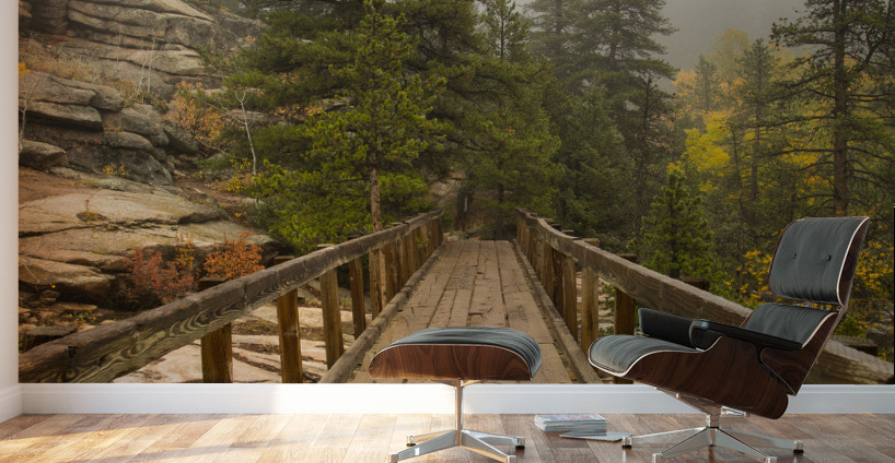 Cropped version up tp 48x36 of cool rustic wooden hiking bridge crossing over St St Vrain Creek into the low clouds. A nice place to take a walk in the woods. West Boulder County Colorado. Beautiful Roosevelt National Forest above Boulder Colorado.