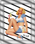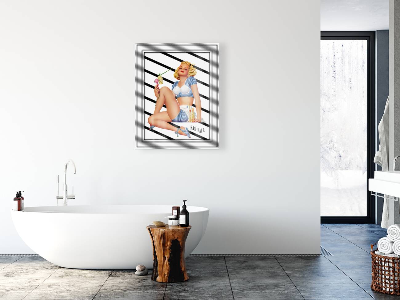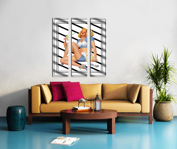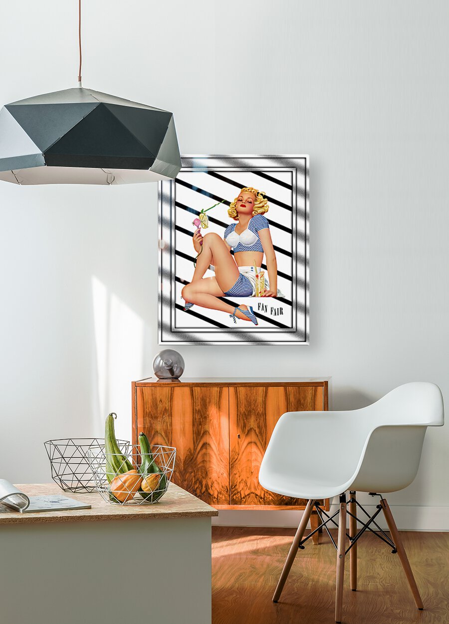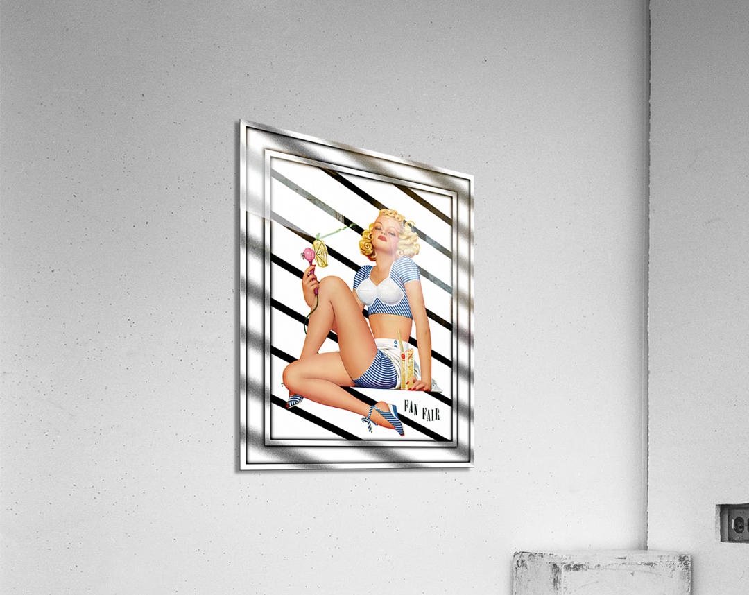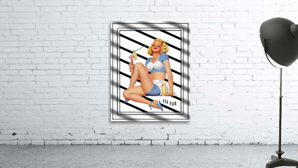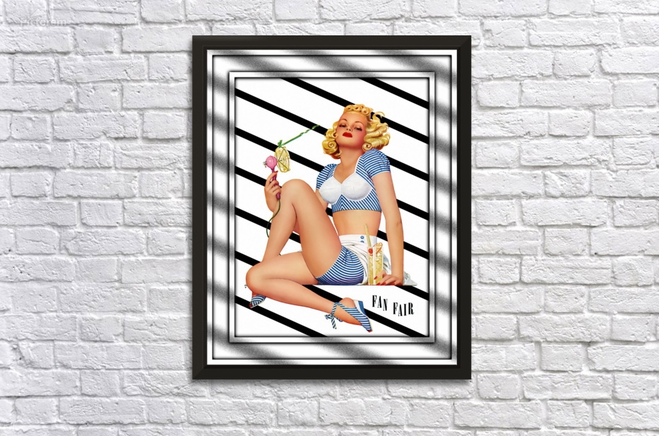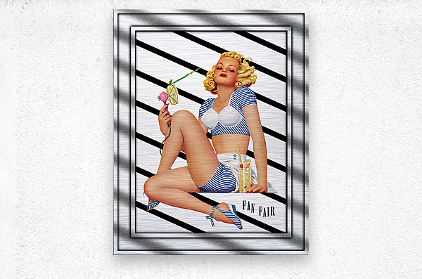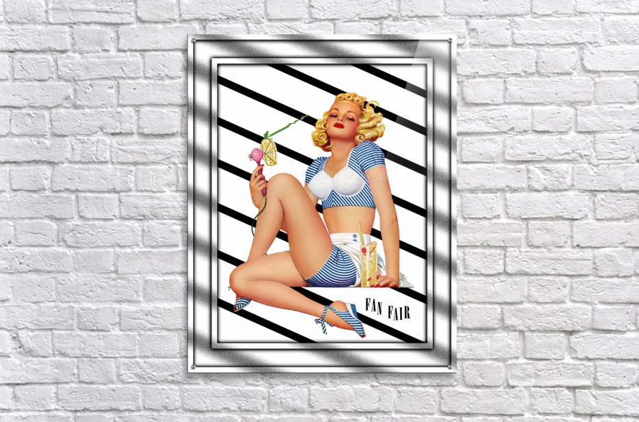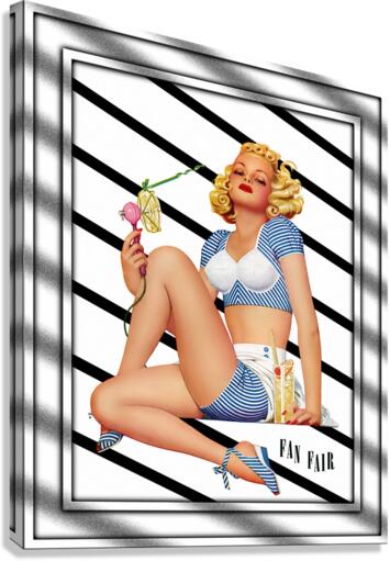 Fan Fair by American Painter Enoch Bolles (1883 - 1976); known as a glamour style pin-up art illustrator. A beautiful alluring blonde pinup girl enjoys a nice cool breeze from a pink electric hand fan with a yellow cage she is holding in her right hand, which is pointed at her face...