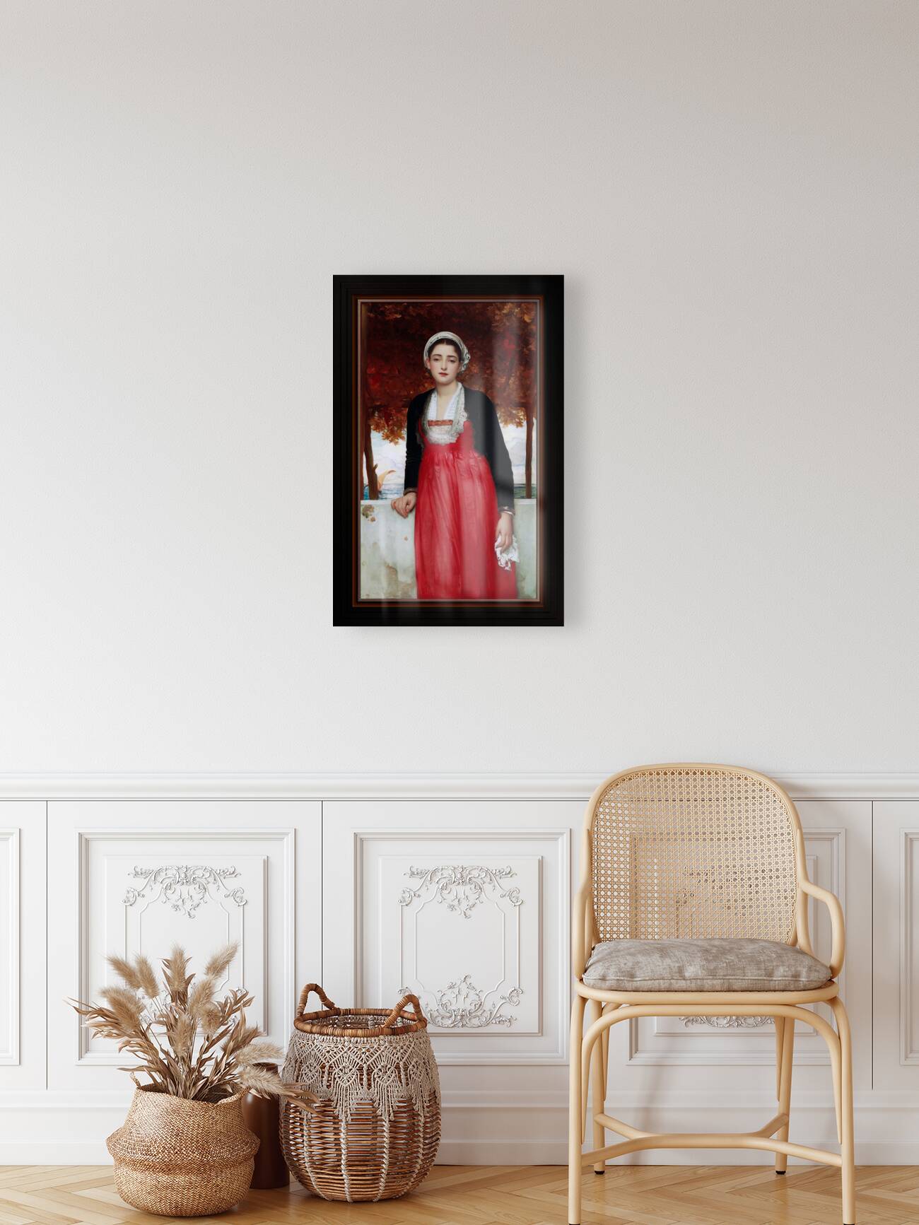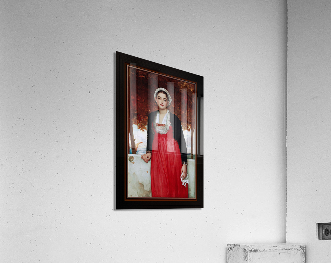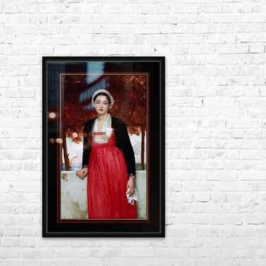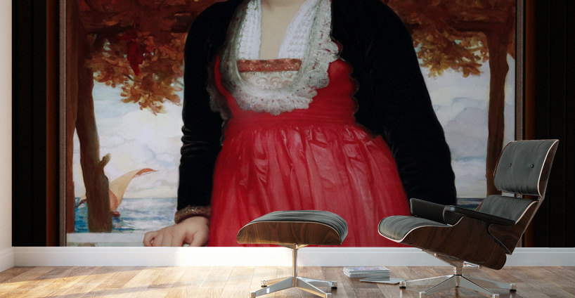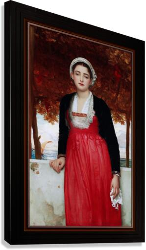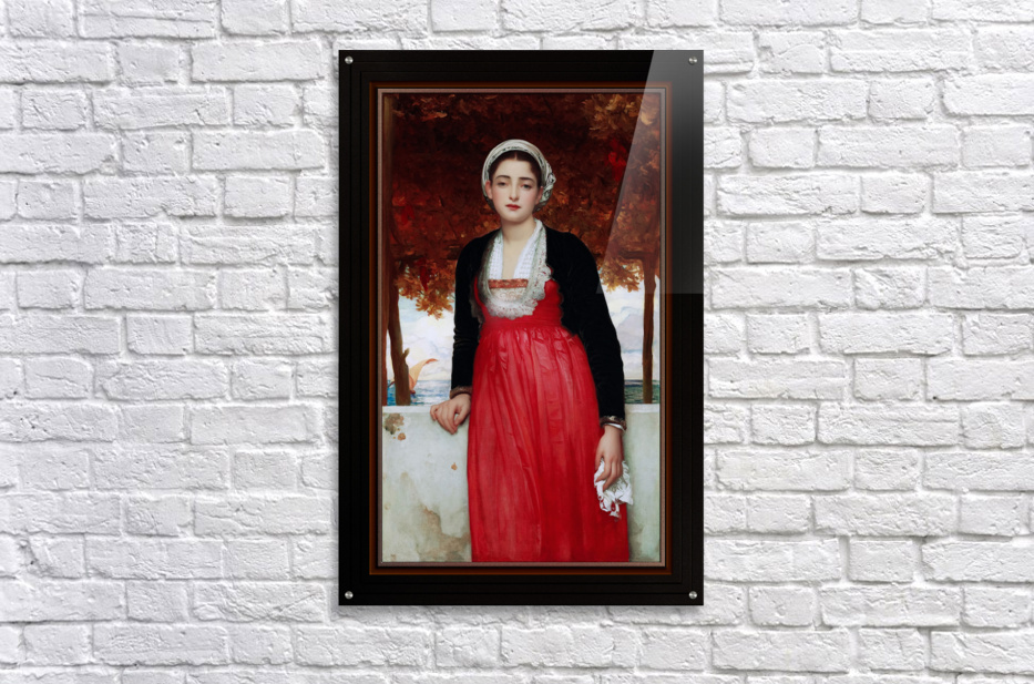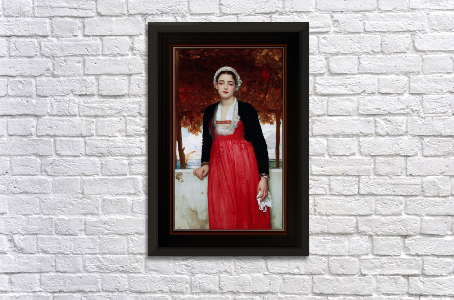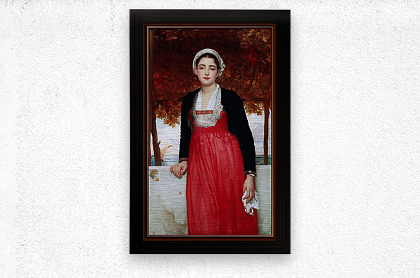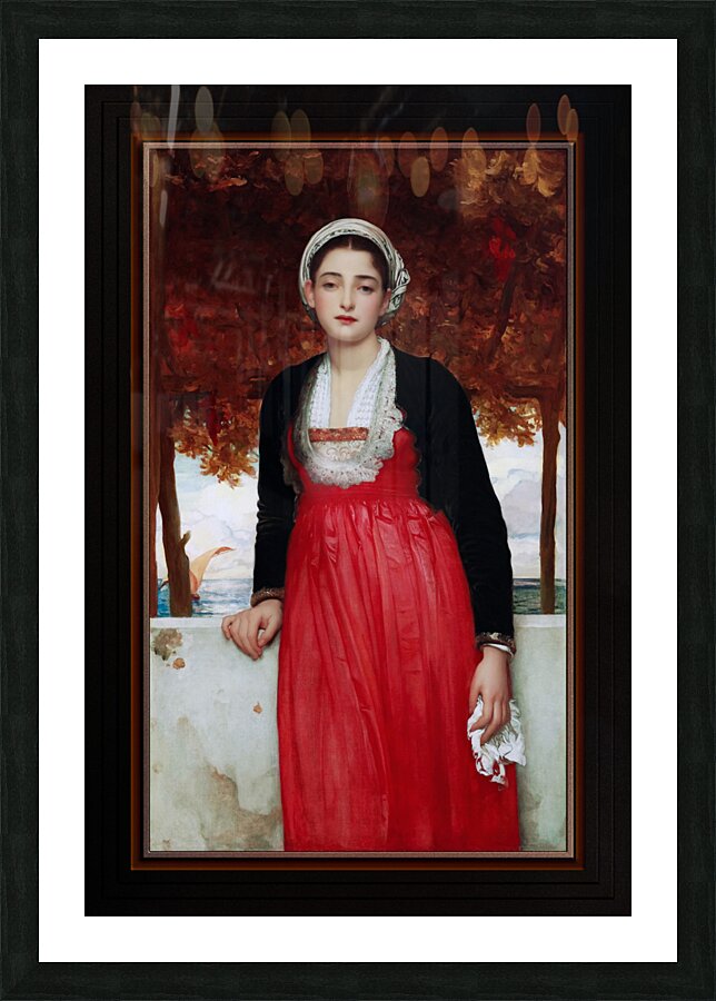 Amarilla by British Painter Frederic Leighton (1830 - 1896); was a painter and a sculptor, who was part of the Academic, Neoclassic and British Aesthetic Movements; as well as a politician. This is a beautiful portrait of a young alluring brunette girl with a sad look on her face posing by a stone wall that overlooks the ocean and a shoreline of green foliage.