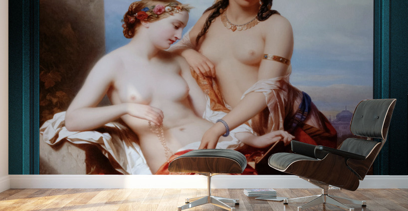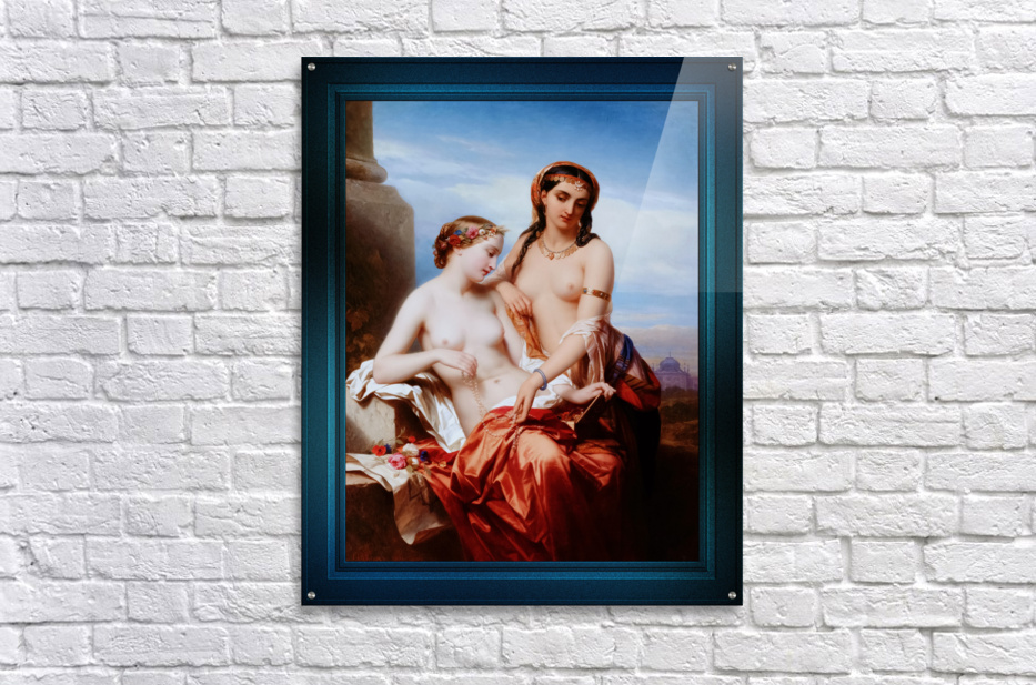 The Orient and the Occident c1854 by Belgian Painter Nicaise de Keyser (1813 - 1887); who specialized in portraiture and historical paintings and who was a main figure in the Belgian Romantic-Historical School of Painting. This is a portrait scene of two partially nude women, which depicts a young attractive Oriental woman wearing a line and bar pattern kerchief of orange, tan and white colors tied around her dark brown hair...