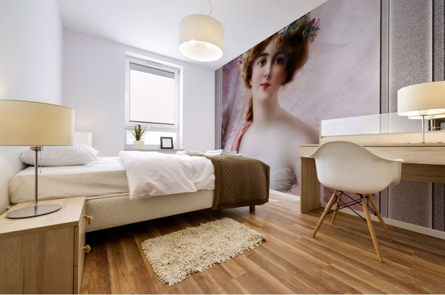 A Summertime Beauty by French Painter Emile Vernon (1872 - 1920); who specialized in painting watercolors, with his main subject being women and children in bright and colorful rural settings. He trained under William Bouguereau and Auguste Trouphème in the School of Fine Arts in Paris France. This is a vintage art portrait of a beautiful young lady depicted in a dream like pose with soft glowing tones; that is wearing a black hair ribbon around her brown hair, that is holding in place a collection of white, red and pink flowers off center of her forehead on either side...