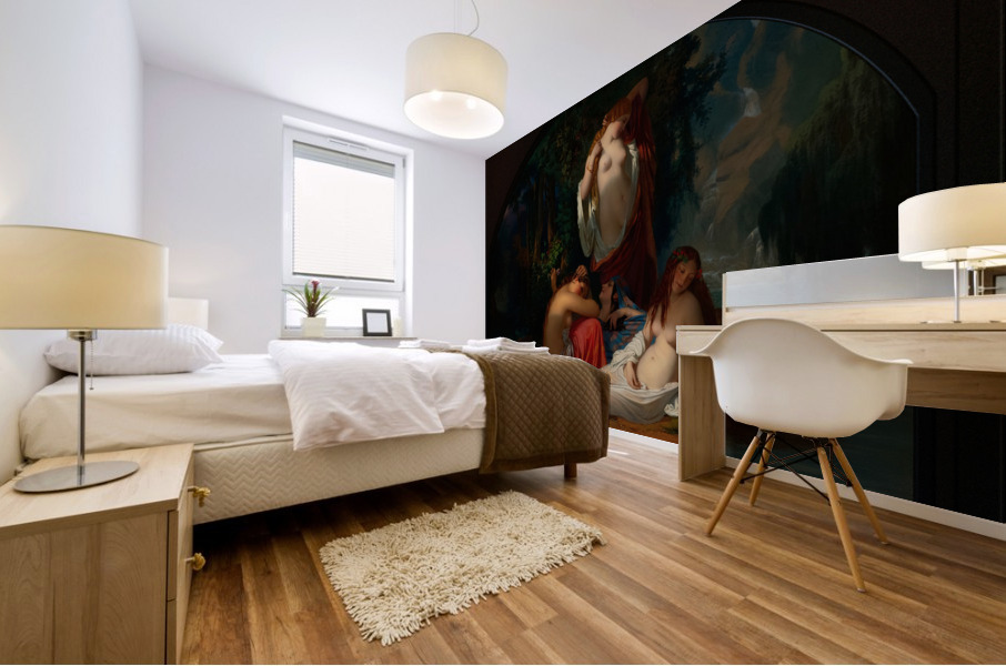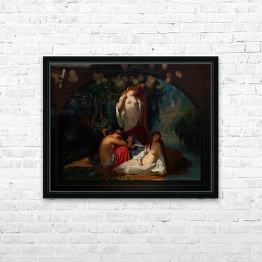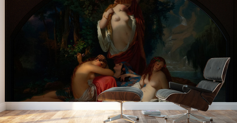 Les Baigneuses - Les Filles De La Source (The Bathers - The Daughters of the Spring) by French Painter Henri Lehmann (1814 - 1882); a painter of portraits, religious & historical scenes, allegorical & literary works and genre scenes. This is a sensual and alluring mythological scene of four women bathers that are the daughters of the spring relaxing on the ground in a forest after taking a bath in the flowing waters of a spring.