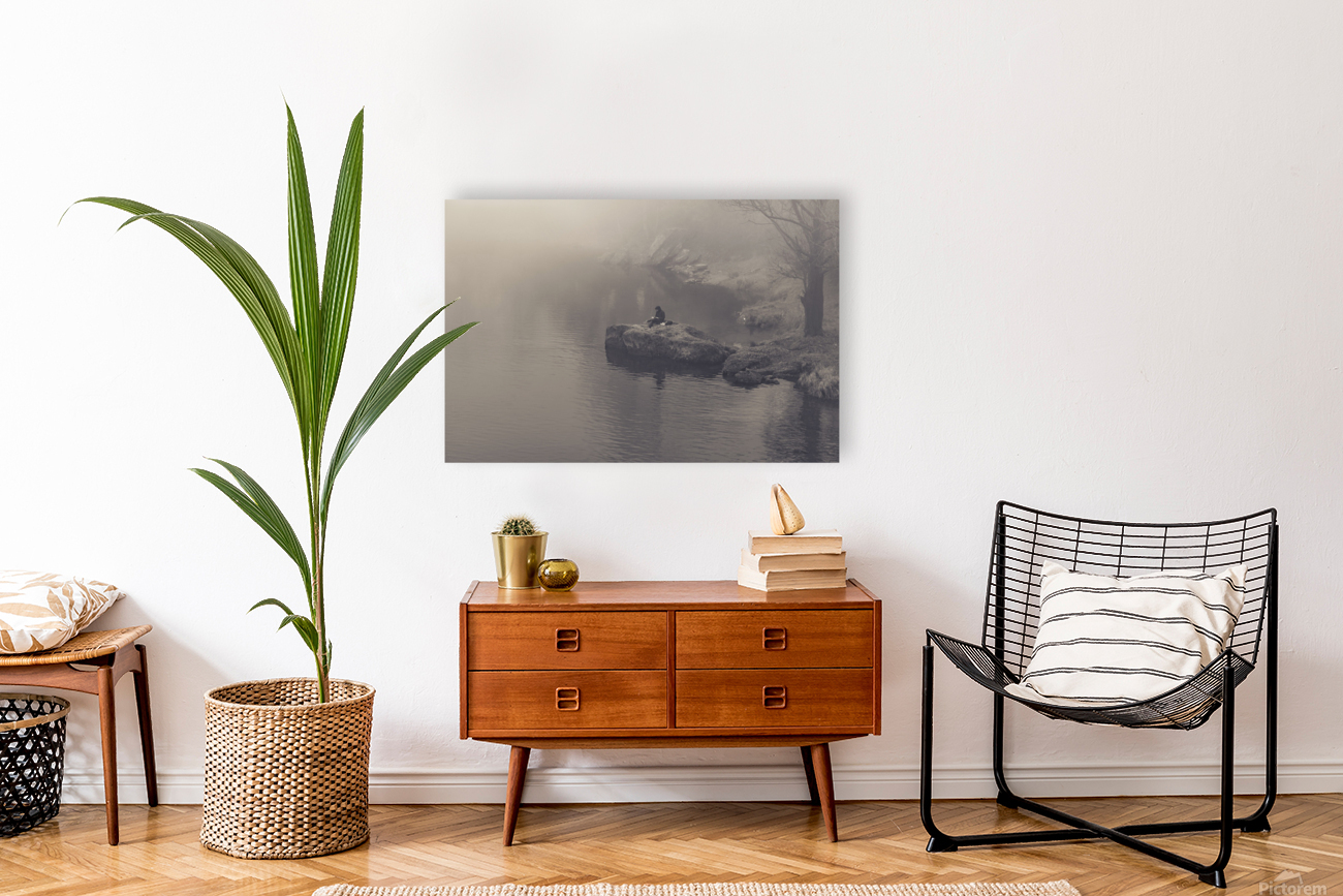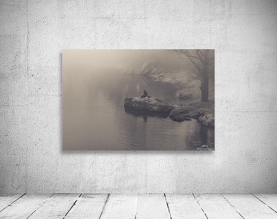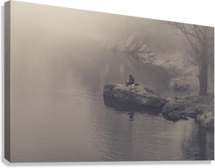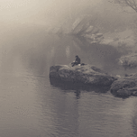 On a winter day a man sitting on a rock by a river surrounded by fog.