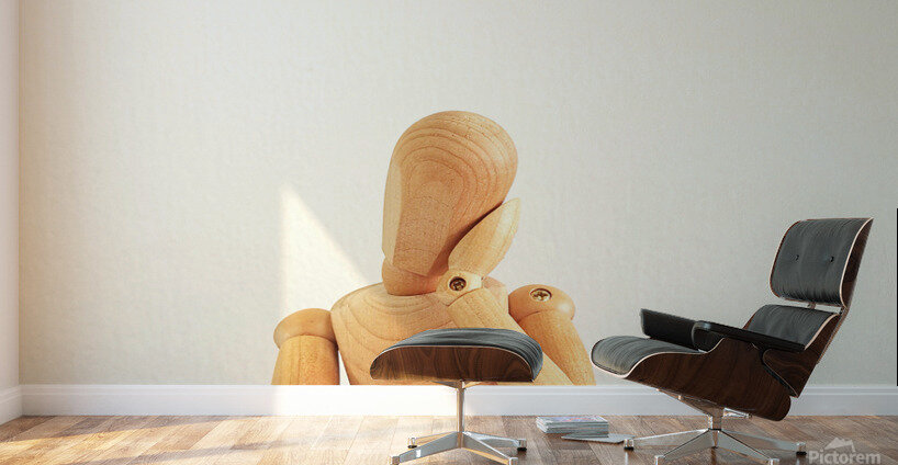 A mannequin seated with his face rests on his hand, seems like thinking or worrying about something.