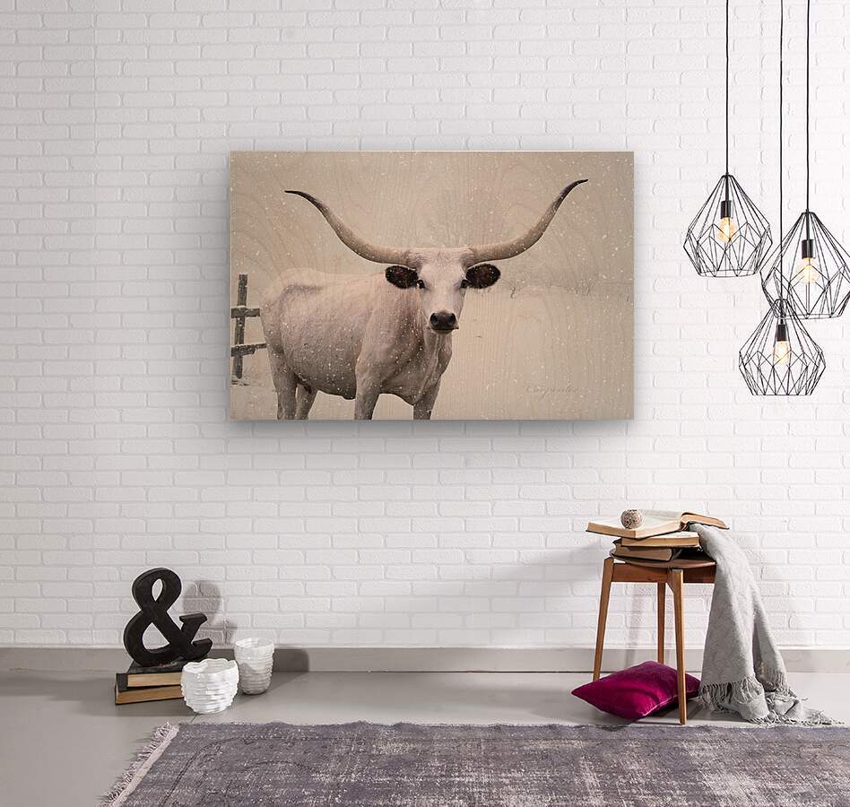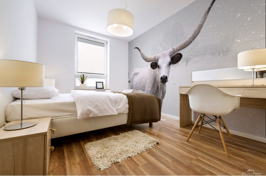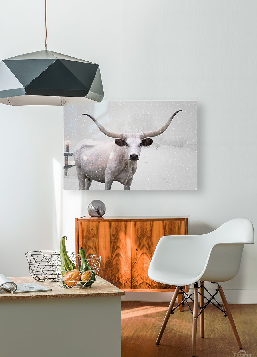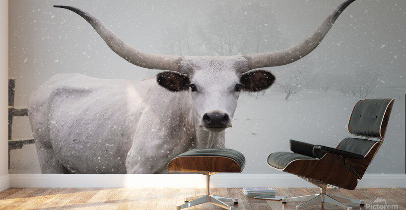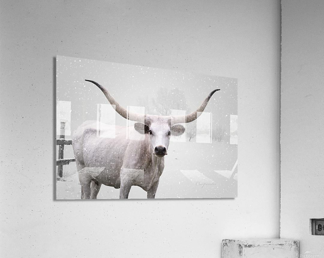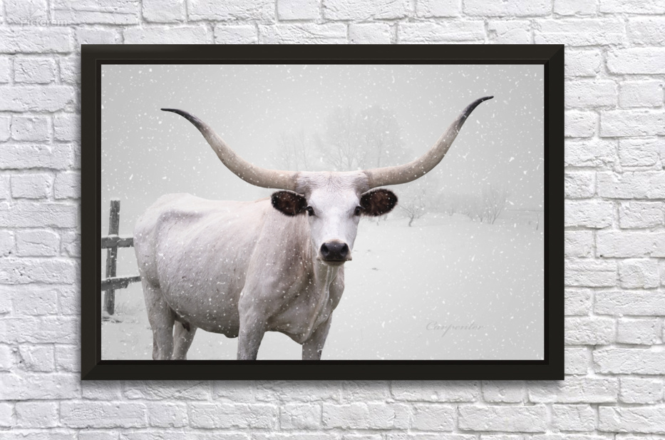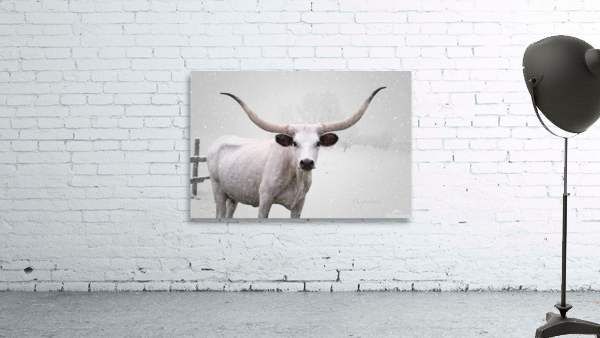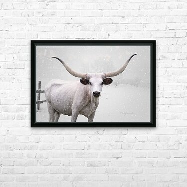 Get this artwork "White Longhorn Cow In Snow" in a framed print.
