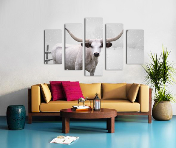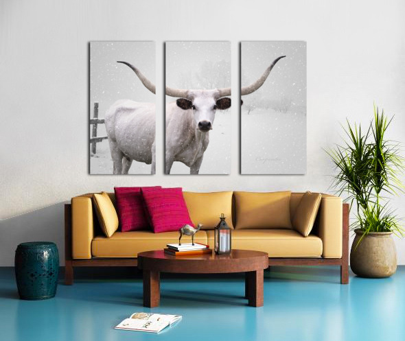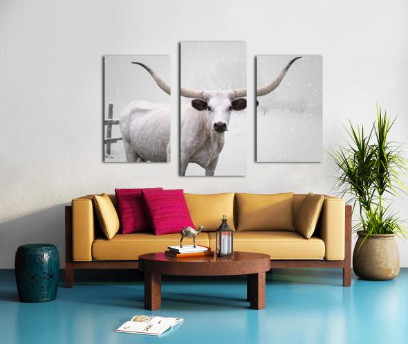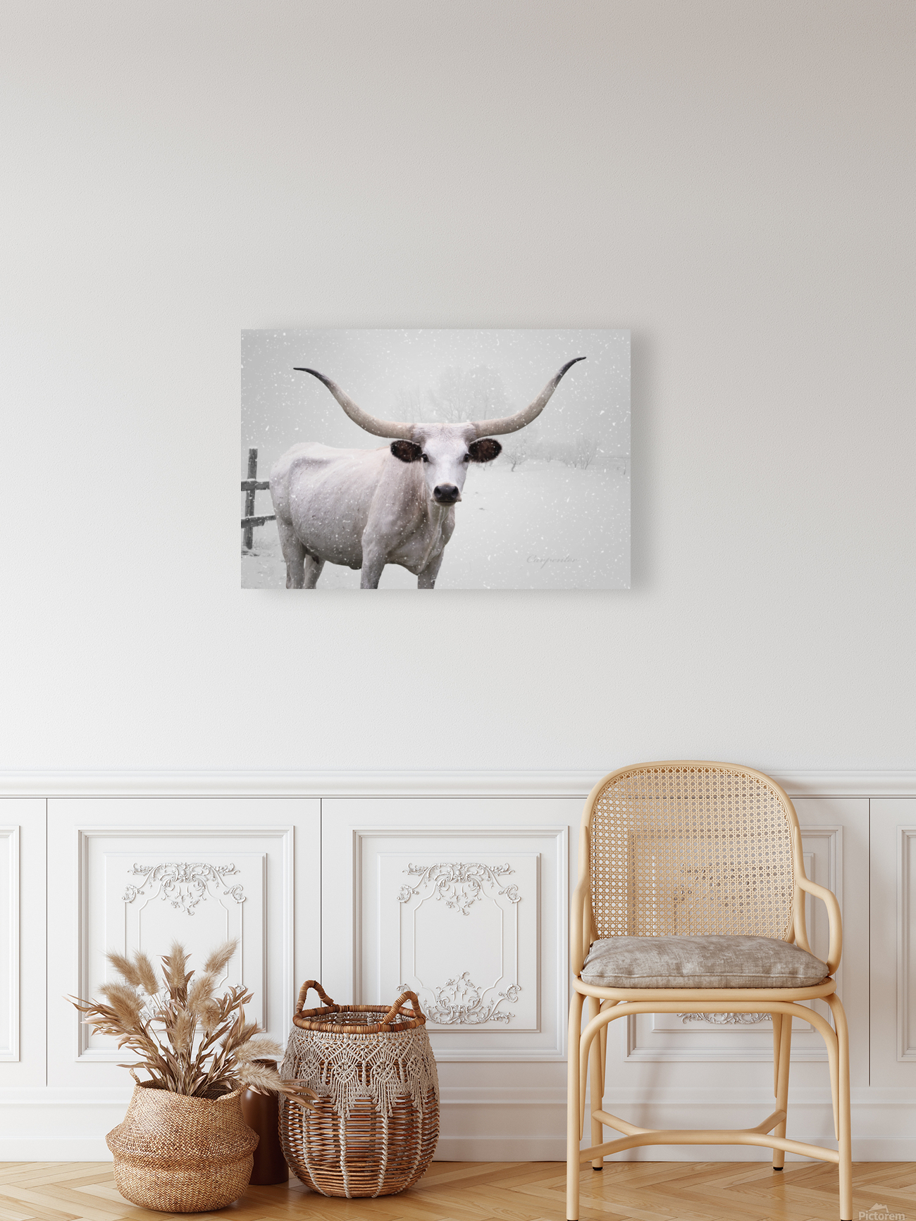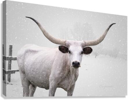 WHITE LONGHORN COW IN SNOW CARPENTER  Canvas Print
