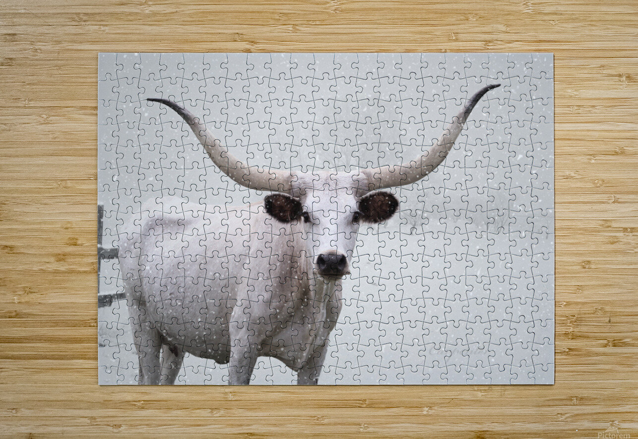 White Longhorn Cow In Snow Carpenter Puzzle printing
