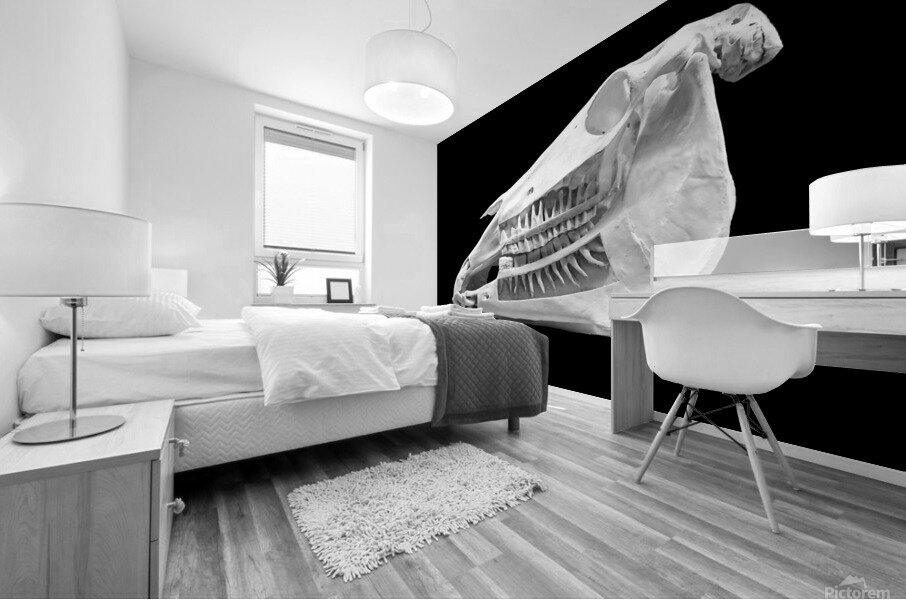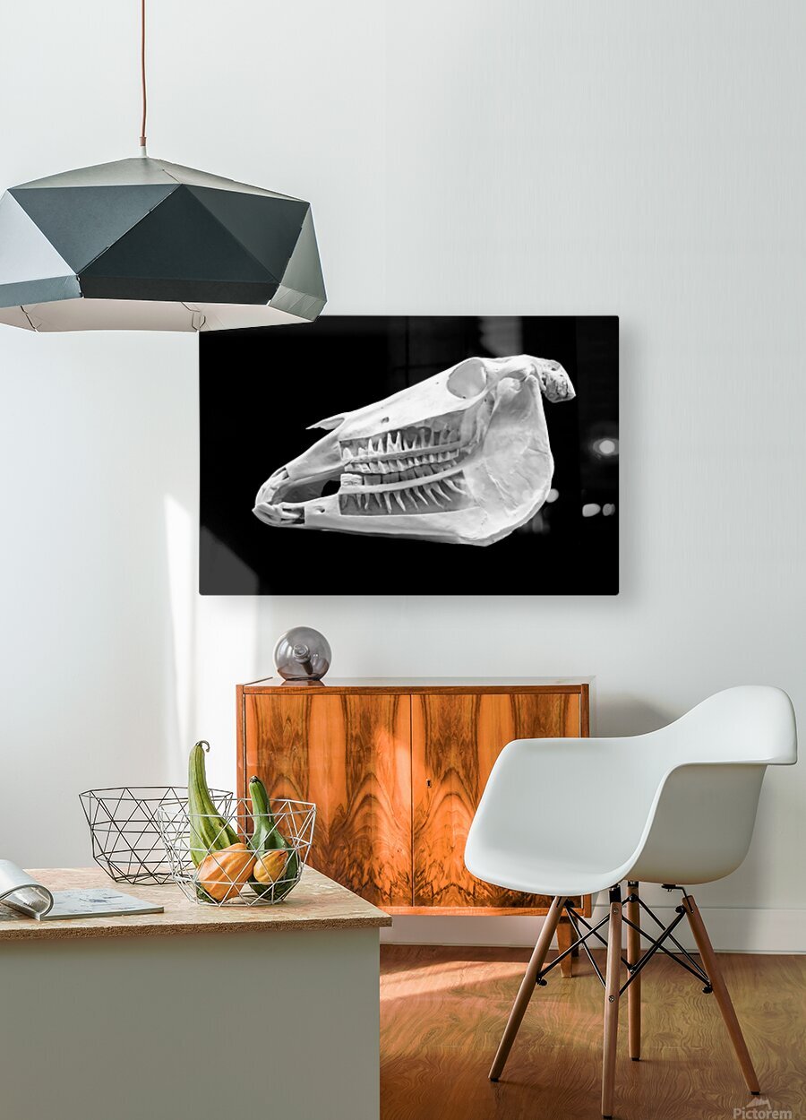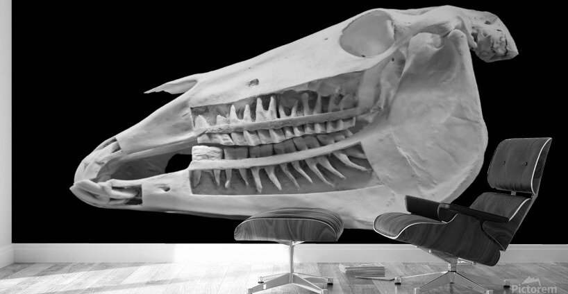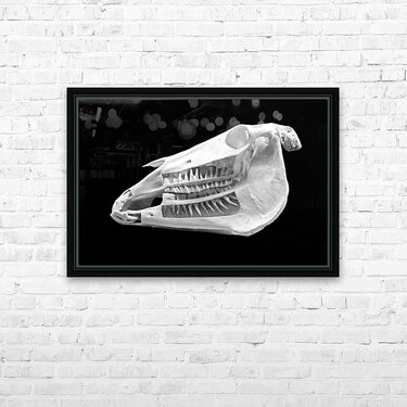 Beautiful black and white image of a horse skull that shows the teeth embedded in the jaw. This photograph makes a great educational tool for any barn, stable, office, arena or veterinary clinic. It is also beautiful as a striking piece of art.