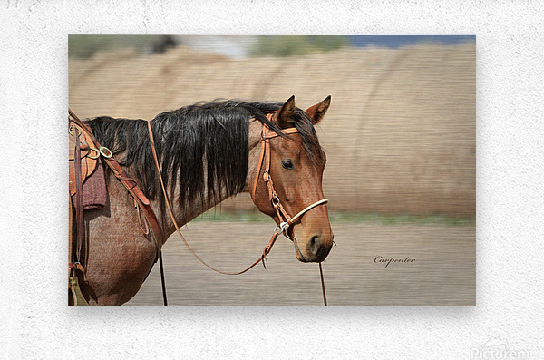 A bay roan cow horse, Lucy, looks beautiful as she stands ground tied waiting on horse cowboy. Soft, neutral colors add to the look of this beautiful horse portrait.