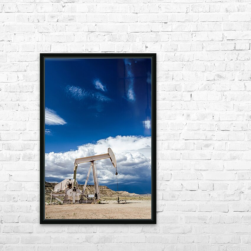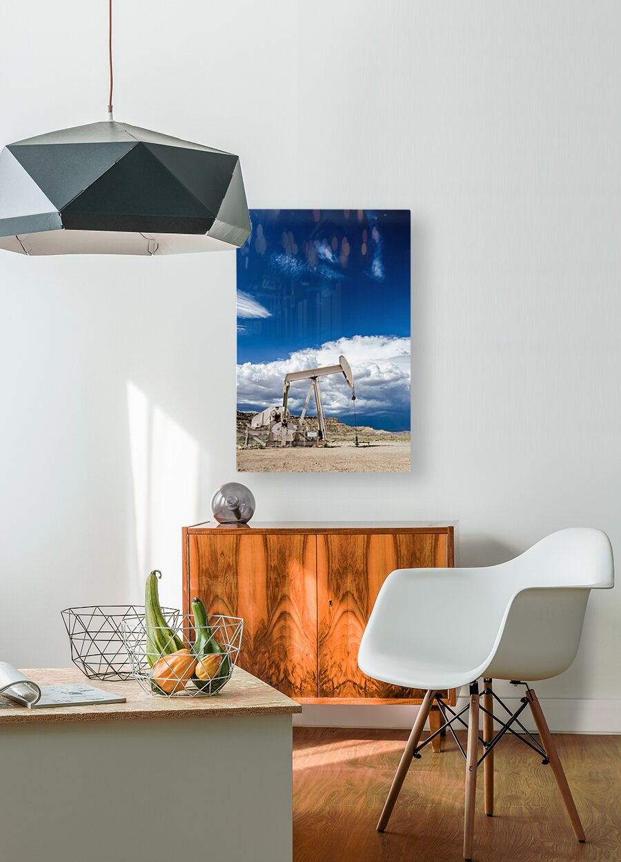 Oil pump in the desert with dark clouds in the background