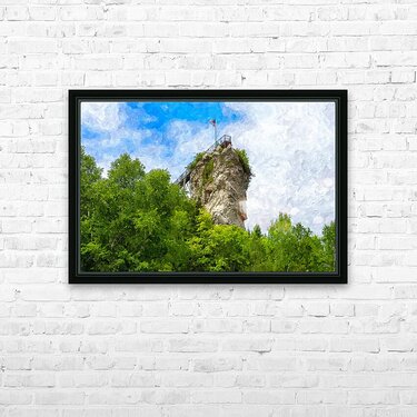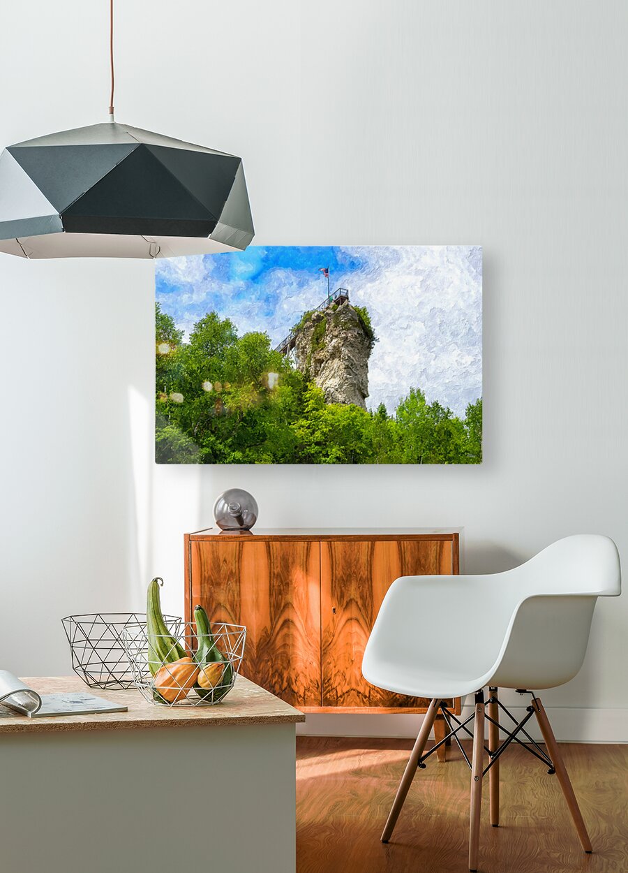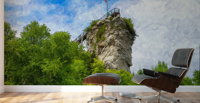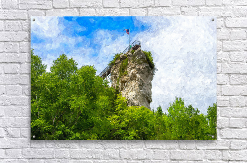 A painterly version of a view looking up at Castle Rock in St. Ignace, Michigan, United States. This cool limestone rock is 200 ft high. It offers expansive views of St. Ignace, Mackinac Island, and Lake Huron. You can see for about 20 miles on a clear day. Castle Rock is considered to be one of the oldest lookout points near the city. The Ojibwa Tribe called it the "Pontiac's Lookout". This is a photo I took and turned into a digital painting. This photo was taken by Jennifer White with Timeless Moments Photography and turned into a digital painting. All images are copyrighted © Timeless Moments Photography/Jennifer White. All rights reserved. Please note the watermark does not print on ordered products.