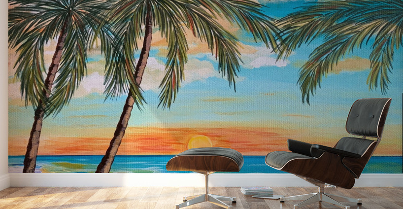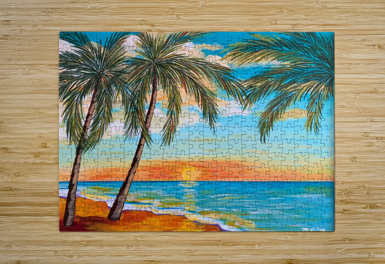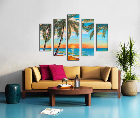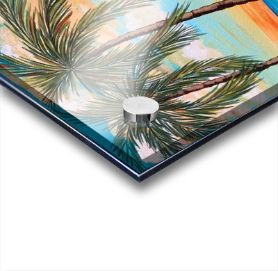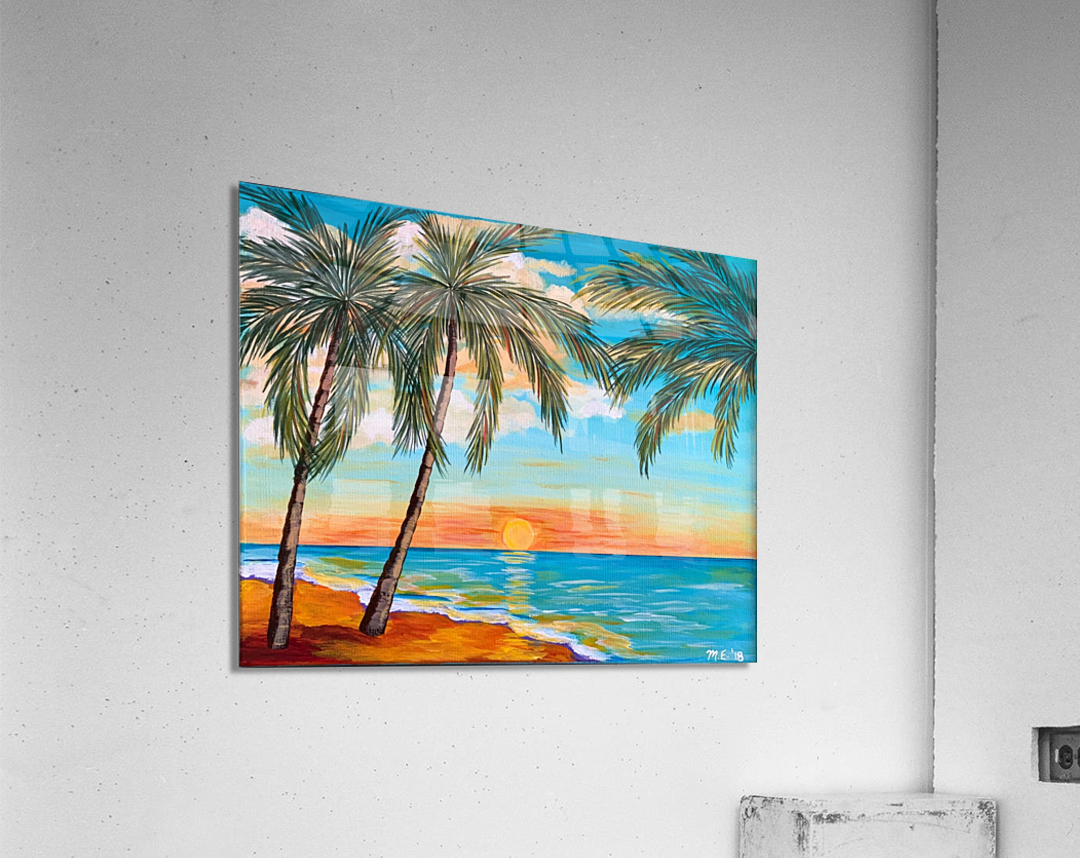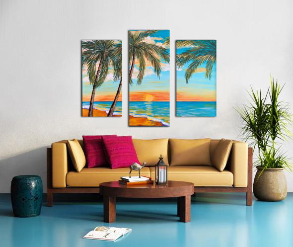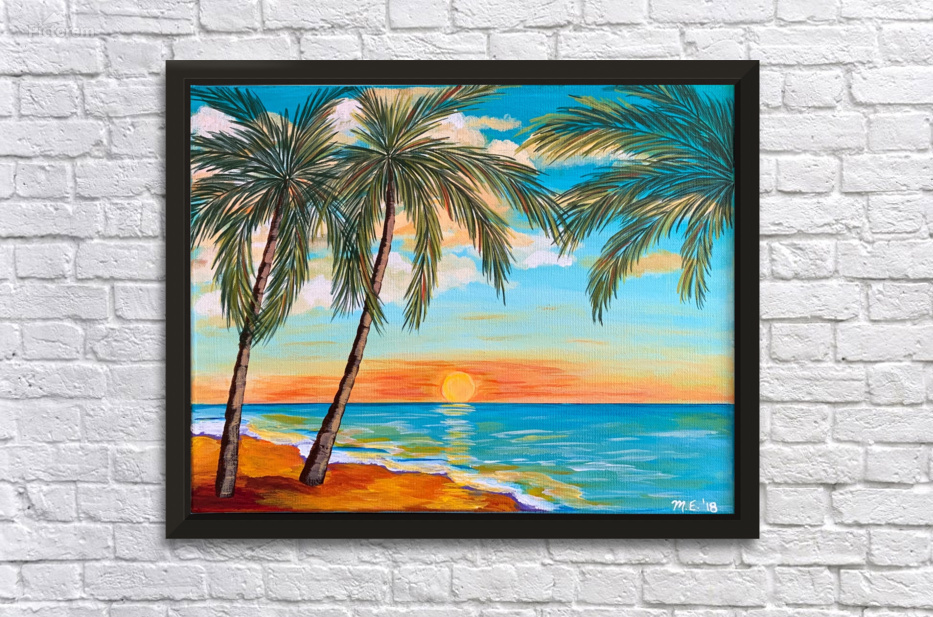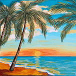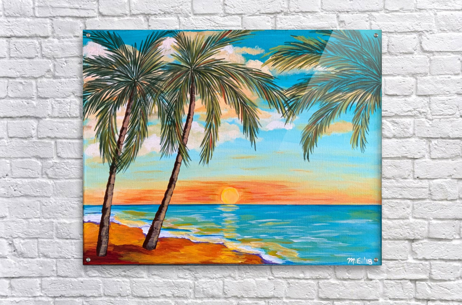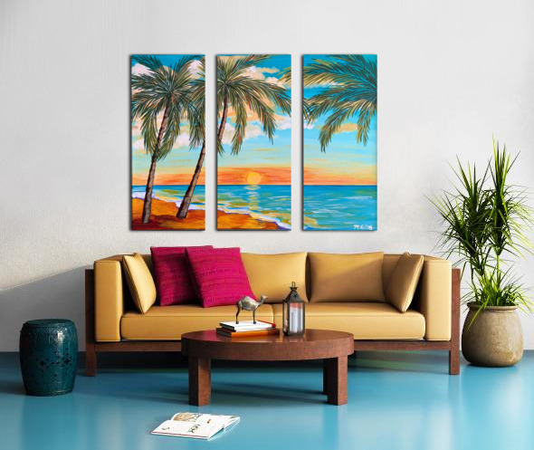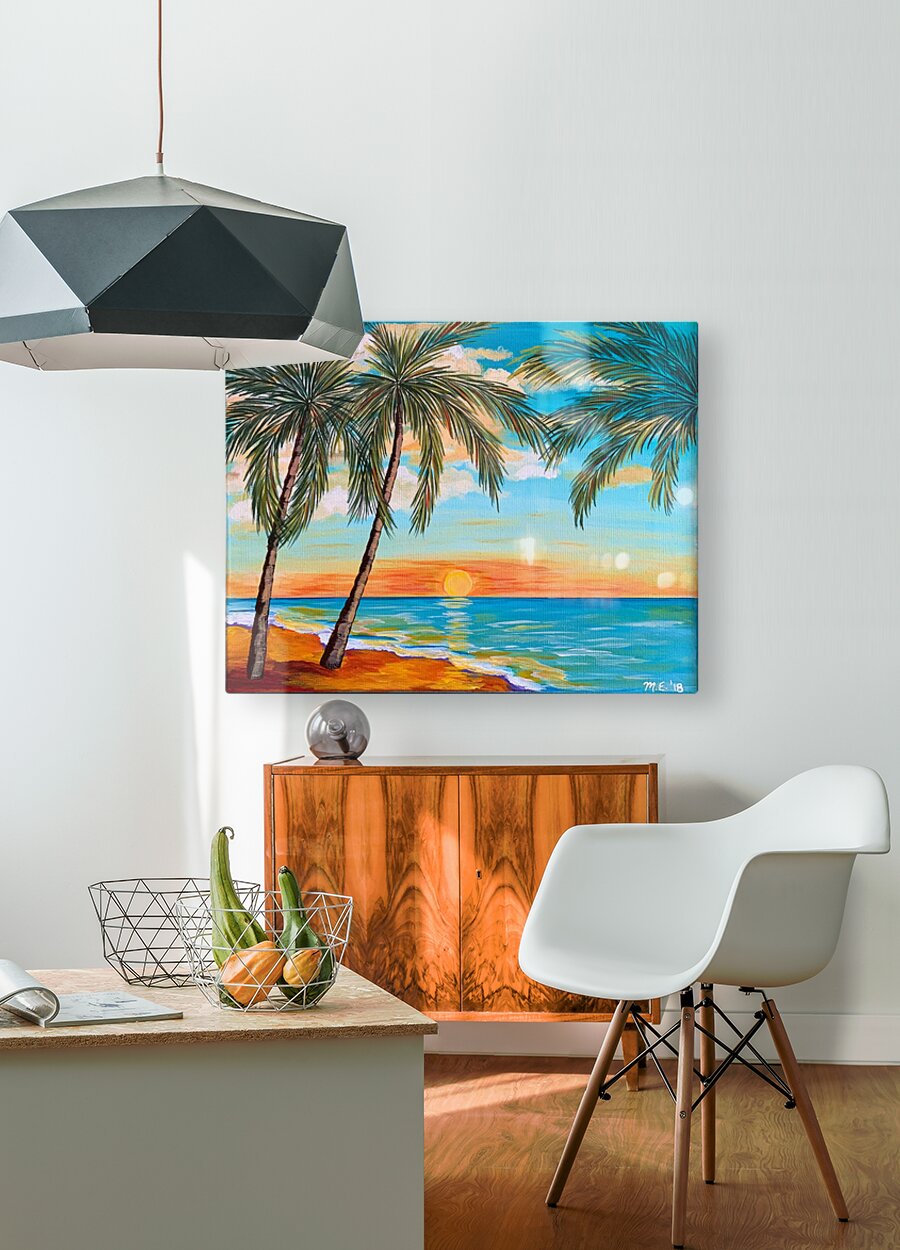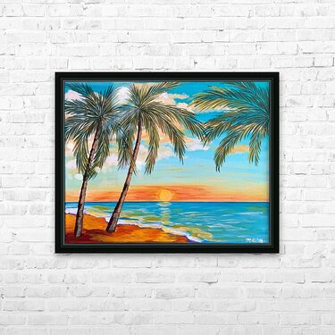 If you like piña coladas and gettin' caught in the rain, you’ll love this tropical landscape. This piece is a mini vacation with a tropical beach, lush palm trees and an alluring turquoise sky with pops of orange. You can almost feel with sun-kissed sand beneath your toes!