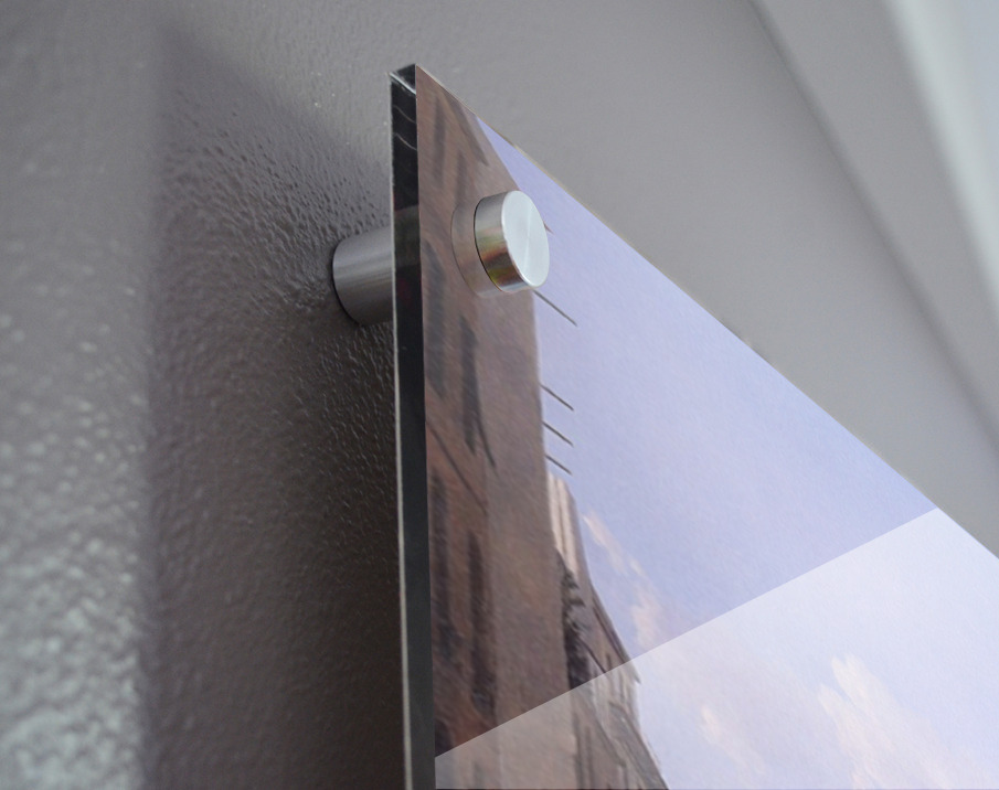 Printed to the edge - Ready to hang - provided with 4 premium polished aluminum stand off ( wall screws and mounting hardware provided )