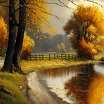 This oil painting depicts a serene autumnal scene , capturing the essence of the season with its warm and earthy tones. The artist has used visible t...[+]