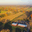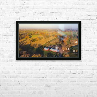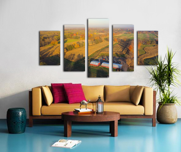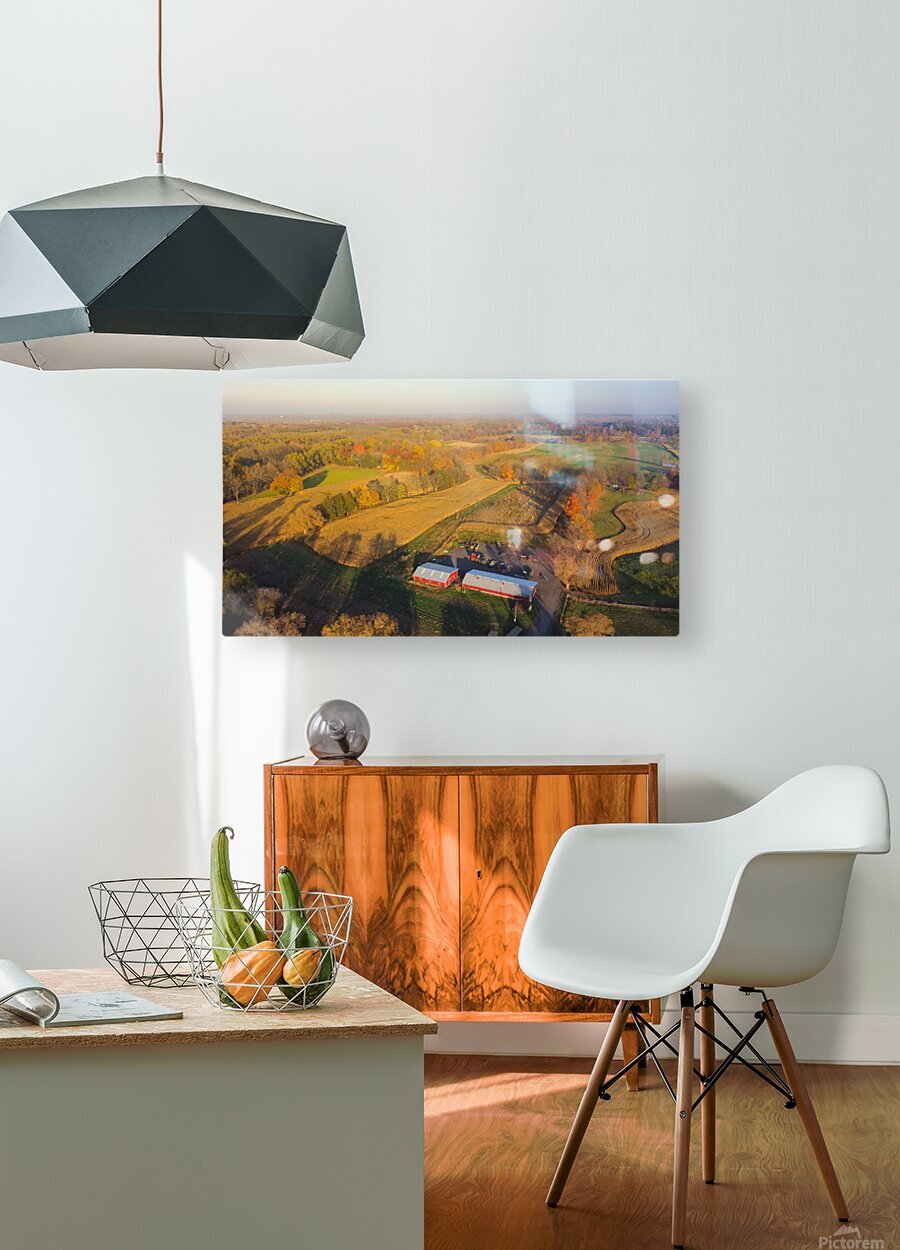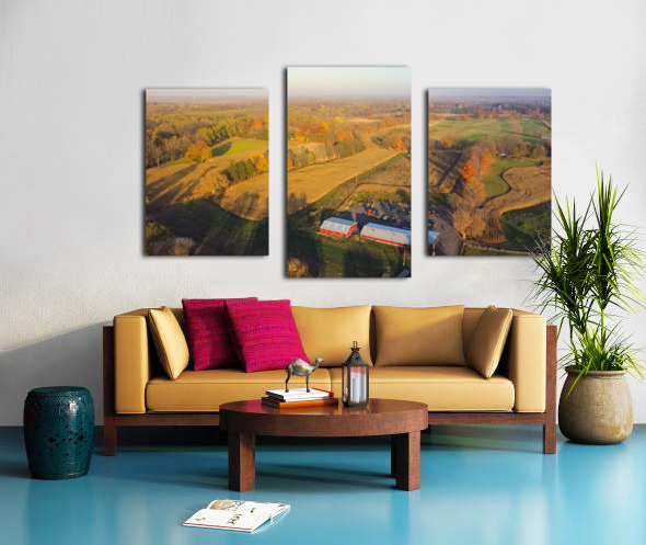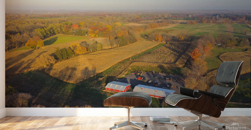 Aerial view scenic fall season in countryside of Rochester Upstate New York rolling corn field to horizonal line traditional red barn farming equipment. Scenery small American town autumn leaves