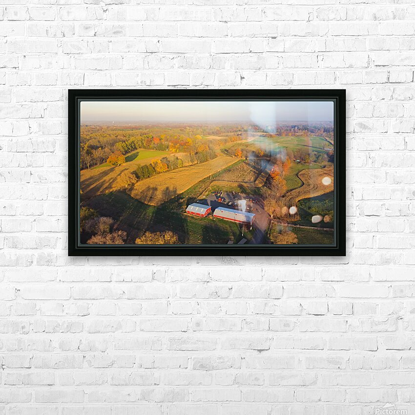 Aerial view scenic fall season in countryside of Rochester Upstate New York rolling corn field to horizonal line traditional red barn farming equipmen...[+]
