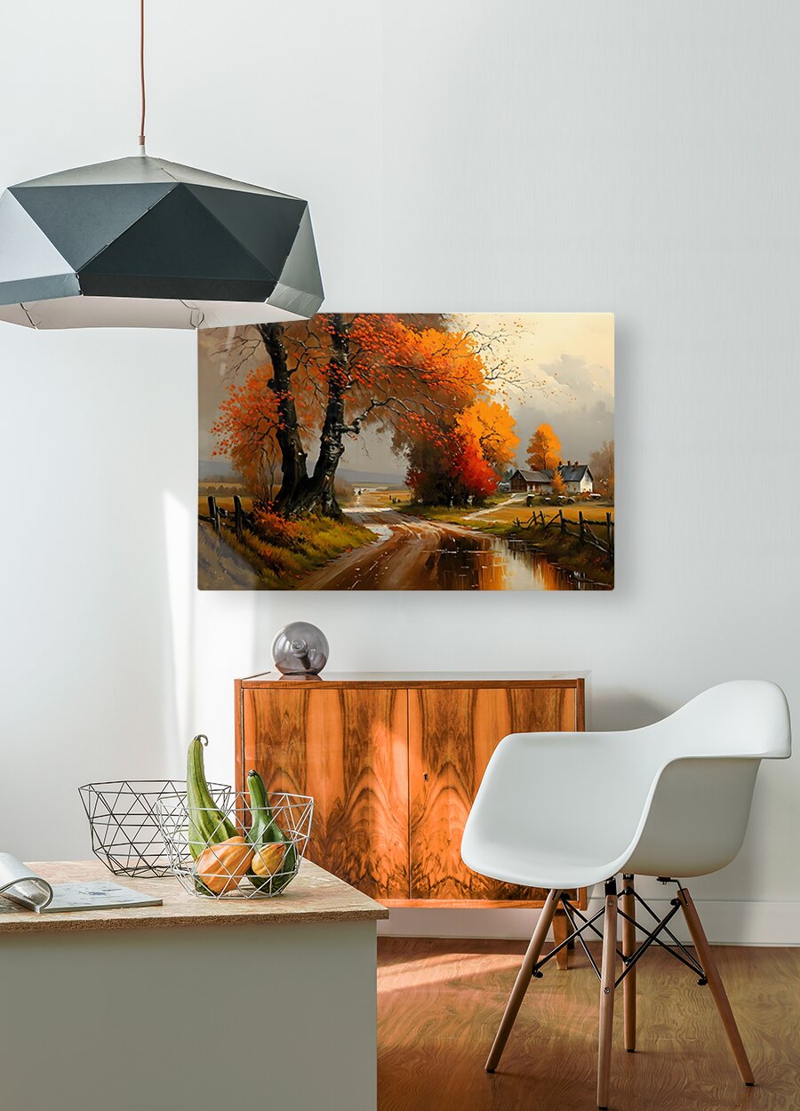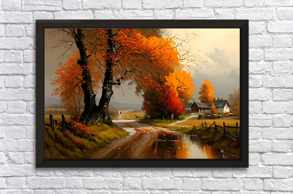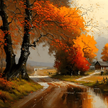 This oil painting depicts a serene autumnal scene , capturing the essence of the season with its warm and earthy tones. The artist has used visible te...[+]