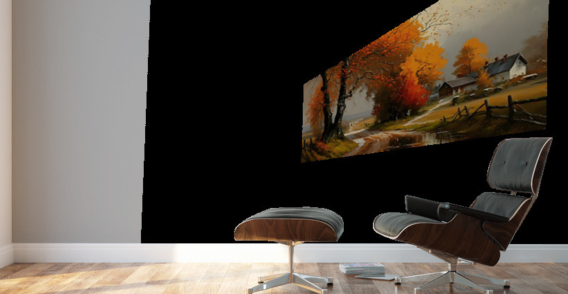 This oil painting depicts a serene autumnal scene , capturing the essence of the season with its warm and earthy tones. The artist has used visible texture to convey the rough, organic quality of the landscape, with bold brushstrokes and thickly layered paint creating a sense of depth and dimensionality. The trees in the foreground are depicted with intricate detail, their gnarled trunks and twisting branches creating a sense of movement and vitality. The overall effect is one of tranquility and contemplation, inviting the viewer to immerse themselves in the peaceful beauty of the autumnal landscape.