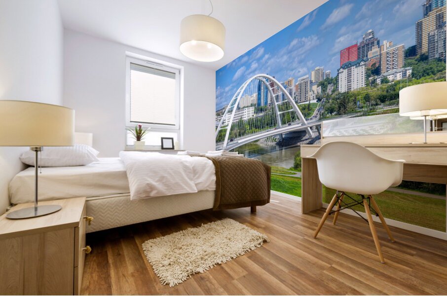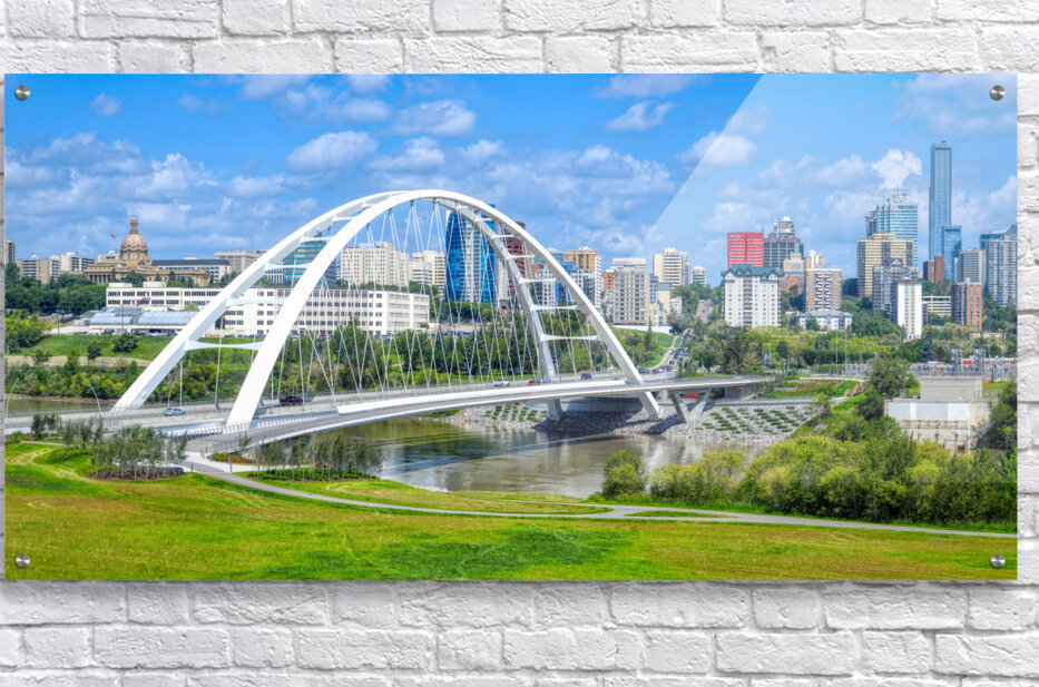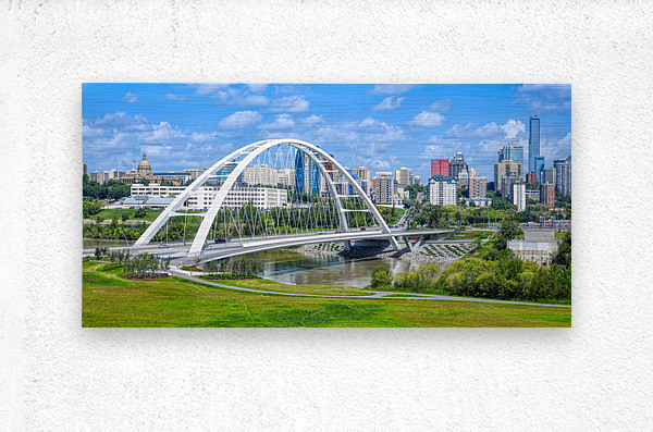 Taken on a beautiful day with white clouds hovering above, this image showcases the Walter Dale Bridge in all its glory, standing tall against the impressive city skyline. The sleek design of the bridge's architecture contrasts beautifully with the natural beauty of the river flowing below, creating a stunning visual experience that will captivate your imagination. This ultra-high resolution photograph is perfect for anyone who appreciates the beauty of modern design or the natural splendor of the river valley. Whether you're a lifelong resident of Edmonton or a first-time visitor, this image will remind you of the city's unique blend of urban sophistication and natural wonder. Add a touch of modern elegance to your home or office with this stunning ultra-high resolution print of the Walter Dale Bridge. Order yours today and experience the wonder of this iconic Edmonton landmark!