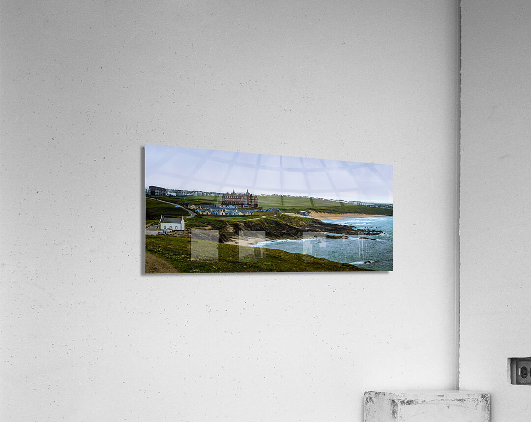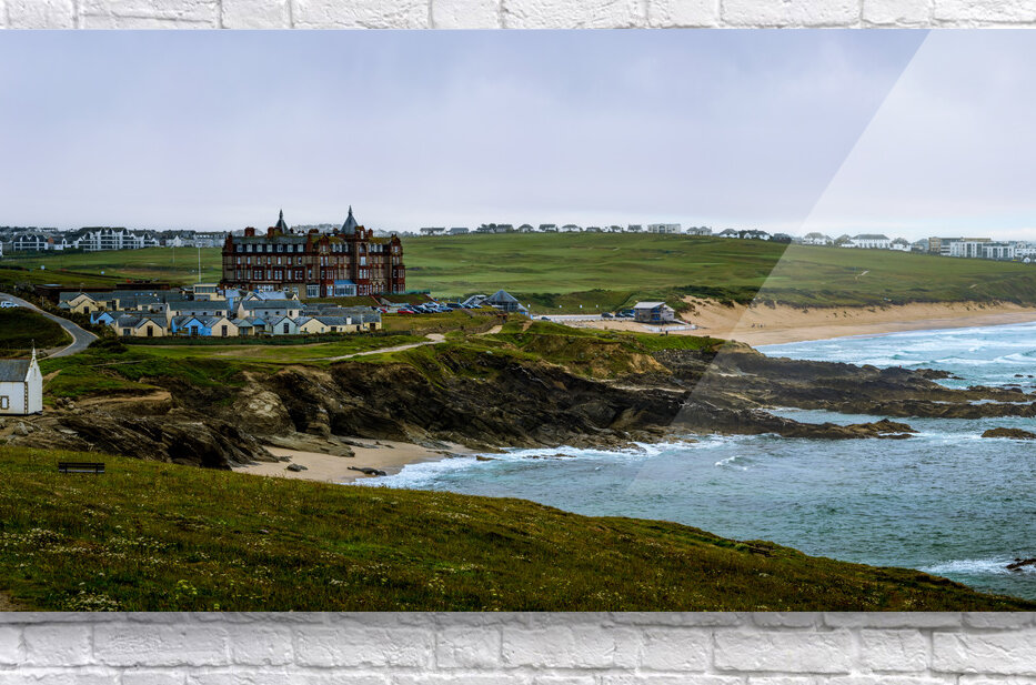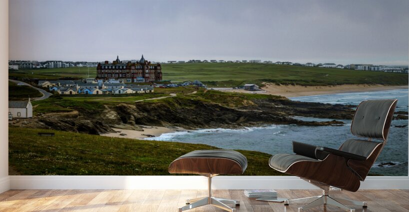 Get this artwork "Tranquil Majesty: The Headland Hotel and Fistral Beach on a Rainy Morning" in a framed print.