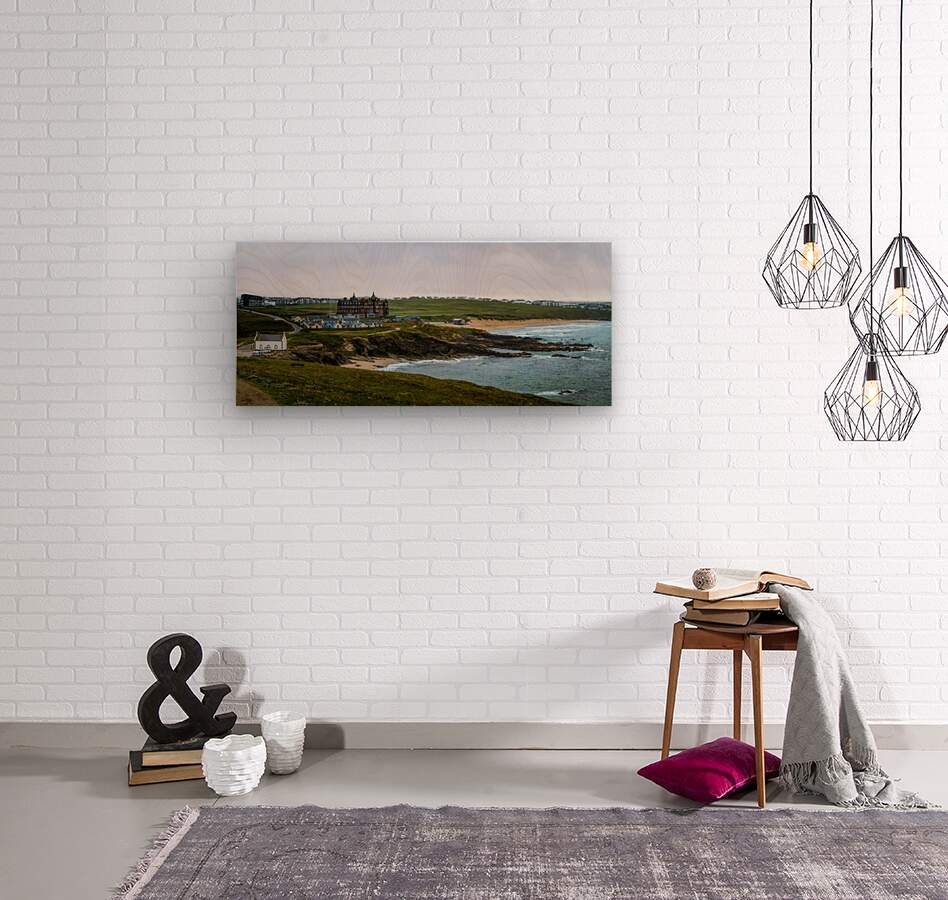 Tranquil Majesty: The Headland Hotel and Fistral Beach on a Rainy Morning Wood print
