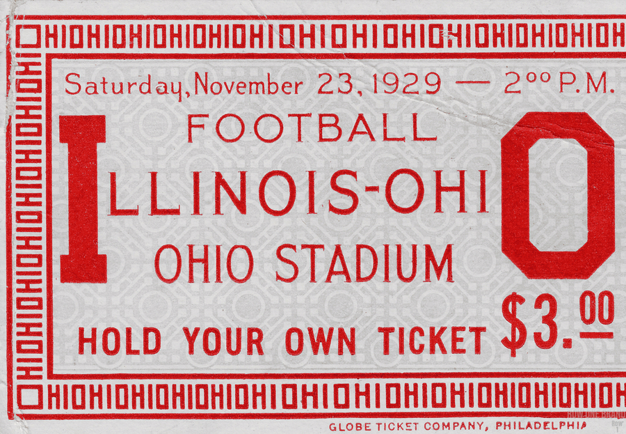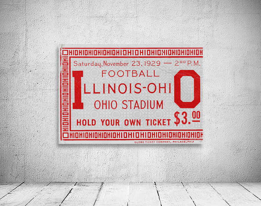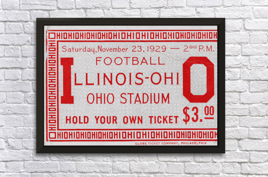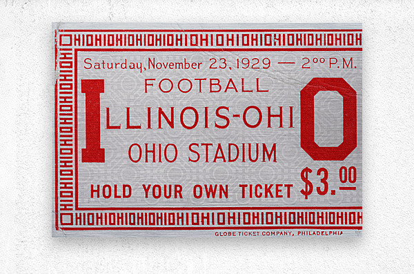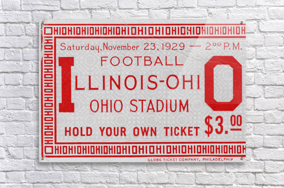 Created from a 1929 Ohio State football ticket stub in our physical collection, this '29 college football ticket wall art will look fantastic in your game room or office. Derivative art © 2023 Row One Brand Row One's historic college sports art is not affiliated with, licensed, sponsored, authorized, or endorsed by any college, university, team, league, artist, athlete, coach, other brand, or any licensing entity. This art was created from a ticket published in 1929 with no copyright notice.