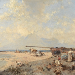 Franz Richard Unterberger was born in Innsbruck, in what was then the Austro-Hungarian Empire, on 15th August 1838, one of eleven children of a wealthy bourgeois family. He decided to pursue a career as an artist at a relatively young age and enrolled in the Academy in Munich. Here he studied with Albert Zimmerman (1808-1888) a professor and landscape painter at the Academy and with Julius Lange (1817-1878). It was as a painter of Alpine landscapes that Unterberger first drew recognition, views particularly set in his native Tyrol. In 1860 Unterberger continued his studies in Düsseldorf; in what was to be a particularly significant period he was much taken by the work of Oswald Aschenbach (1827-1905) a landscape painter and his brother Andreas (1815-1910) also a landscape painter who worked extensively in Scandinavia before moving to Italy in the 1870’s. Düsseldorf was the favoured academy for Scandinavian painters studying abroad and as a result of this northern influence Unterberger was drawn to Scandinavia where in the early 1860’s he produced a number of atmospheric mountainous scenes. Following this period Unterberger moved to Brussels, largely since he believed the art market there was likely to be more lucrative, he was to live and work there periodically for most of his life, though never acquiring a property or citizenship. Unterberger was becoming a truly European artist, in the 1860’s painting from Norway to Sicily. By the 1870’s he was exhibiting throughout Europe, Hamburg, Antwerp, Brussels, Berlin, Stuttgart, Paris, Munich, Vienna and in addition Philadelphia and Boston. He was now painting panoramic Italian scenes, coastal landscapes set in Southern Italy, Capri, Naples, Amalfi, Sorrento, Palermo and views set in Venice his works suffused with a warm Mediterranean light and a shimmering silvery tone.