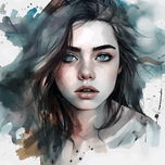 This painting depicts the portrait of a young girl with a striking and expressive face. The portrait has been created using a watercolor technique, wi...[+]
