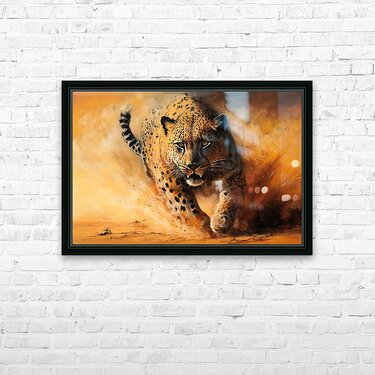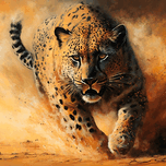 This painting depicts a wild animal with highly visible brushstrokes that give it a dynamic and textured look. The brushwork is loose and expressive, conveying an impression of movement and energy that captures the essence of the wild nature of the animal. The animal itself is painted with great detail and realism, with carefully crafted textures and colors that bring it to life. Its fur seems to ripple and gleam in the light, while its eyes are bright and piercing, giving a sense of intelligence and alertness. The background of the image is kept to a minimum, with perhaps only a few traces of leaves or terrain to suggest the animal's natural habitat. This allows the viewer to fully focus on the animal itself and appreciate its beauty and power. Overall, the painting is a stunning tribute to the majesty of the natural world and the awe-inspiring creatures that inhabit it. Bold and visible brushstrokes give the work a sense of immediacy and intimacy, attracting the viewer and inviting him to a close experience of the animal world.