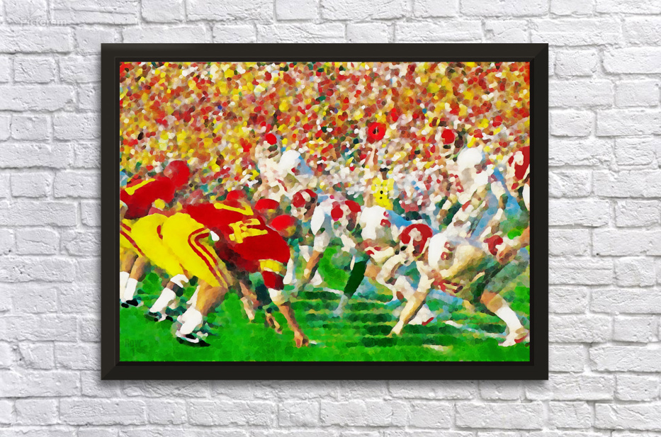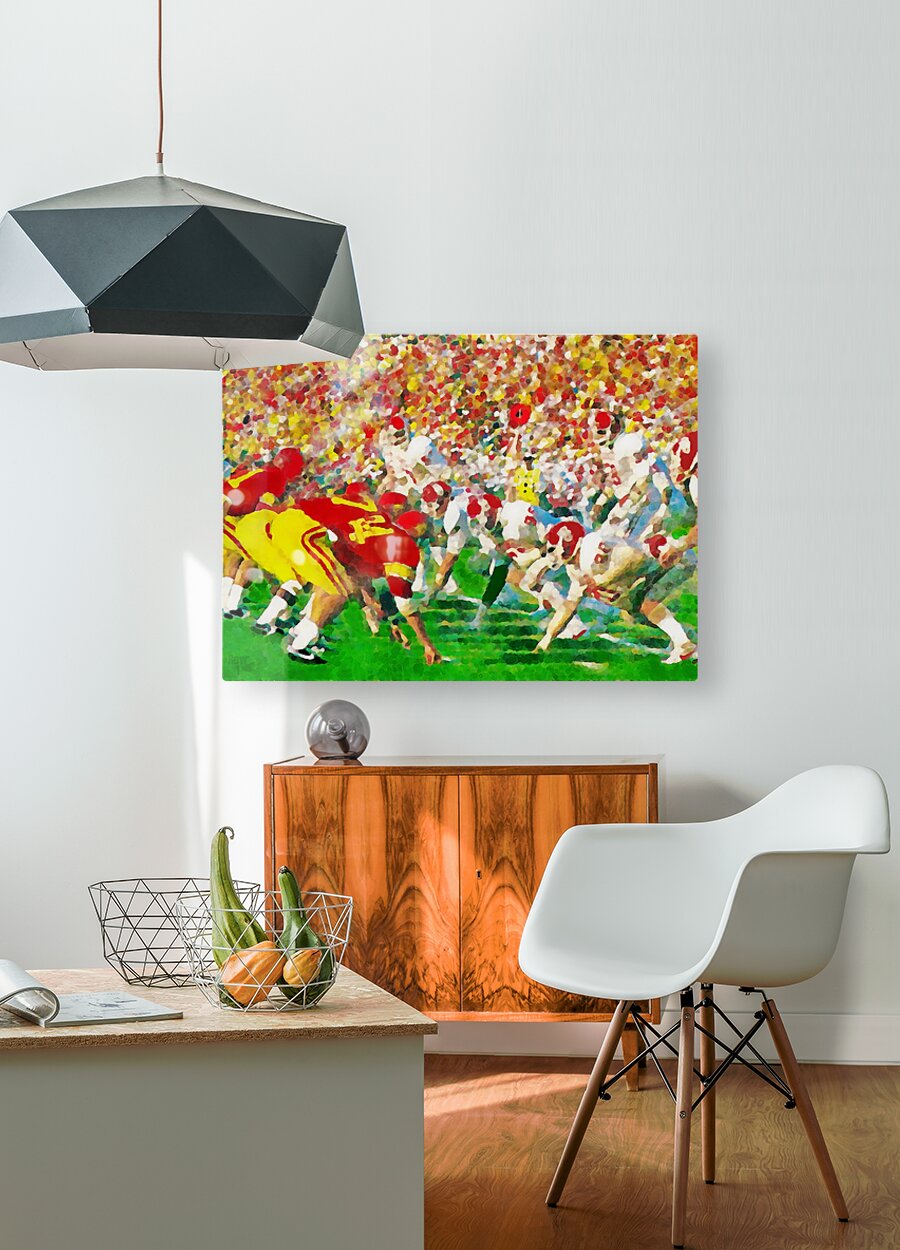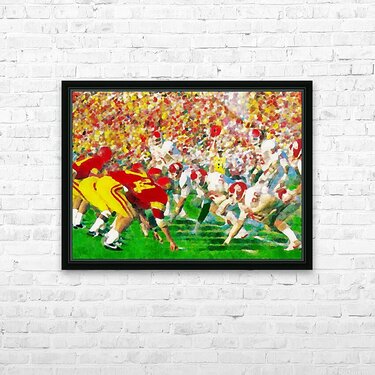 Battle in the Coliseum | Abstract USC-Oklahoma Football Watercolor Art | Row One | This throwback college football art will look fantastic in your game room or office and depicts the Sooners and Trojans squaring off in 1981. © 2023 Row One Brand This historic college football art print is not affiliated with, licensed, sponsored, authorized, or endorsed by any college, university, team, league, artist, athlete, coach, other brand, or any licensing entity.