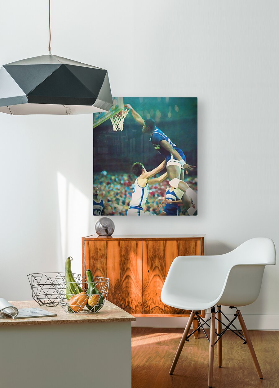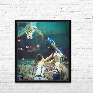 Retro Georgetown Hoyas Basketball Watercolor Art | Row One | Created from retro Georgetown basketball art in our collection and created in a watercolor style, this throwback Georgetown basketball art shows basketball legend Patrick Ewing throwing down a dunk. This college hoops art will look fantastic in your game room or office. © 2023 Row One Brand This historic college basketball art print is not affiliated with, licensed, sponsored, authorized, or endorsed by any college, university, team, league, artist, athlete, coach, other brand, or any licensing entity.