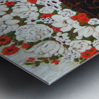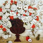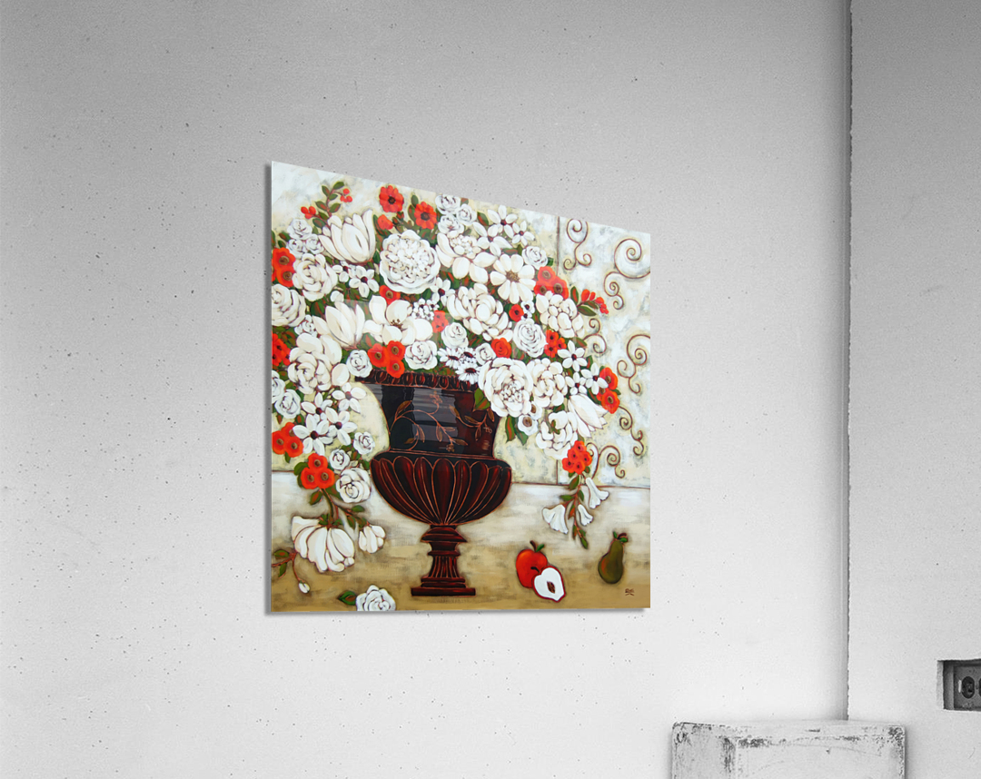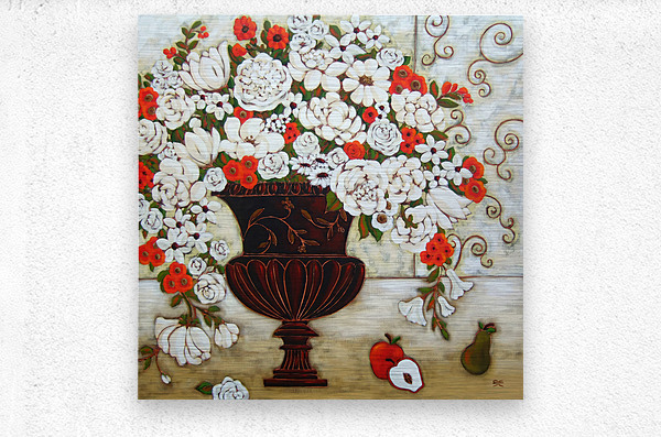 Two Apples and a Pear keep company with a Dazzling and Abundant Bouquet in White and Red. Peonies, Tulips, Roses and Anemones Live Happily Together in a Dark Umber Jardinière sitting in front of an Ivory Background decorated with Curlicues in this Lively Still Life Painting.