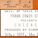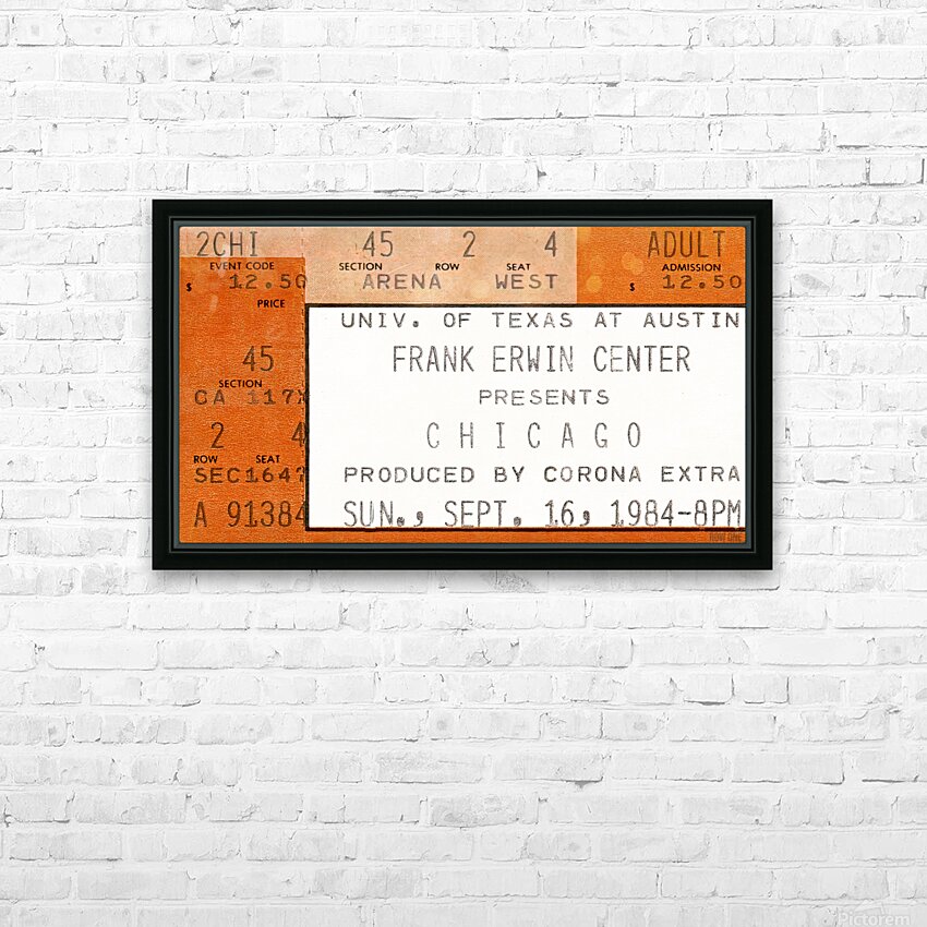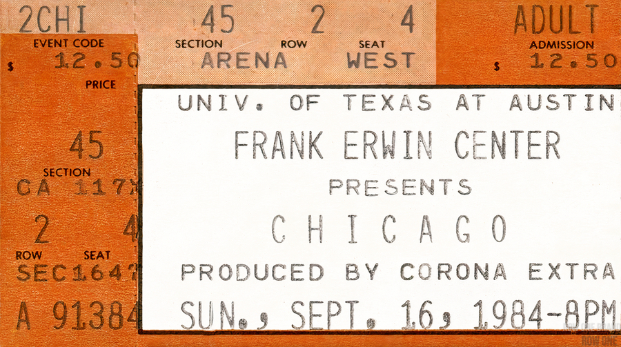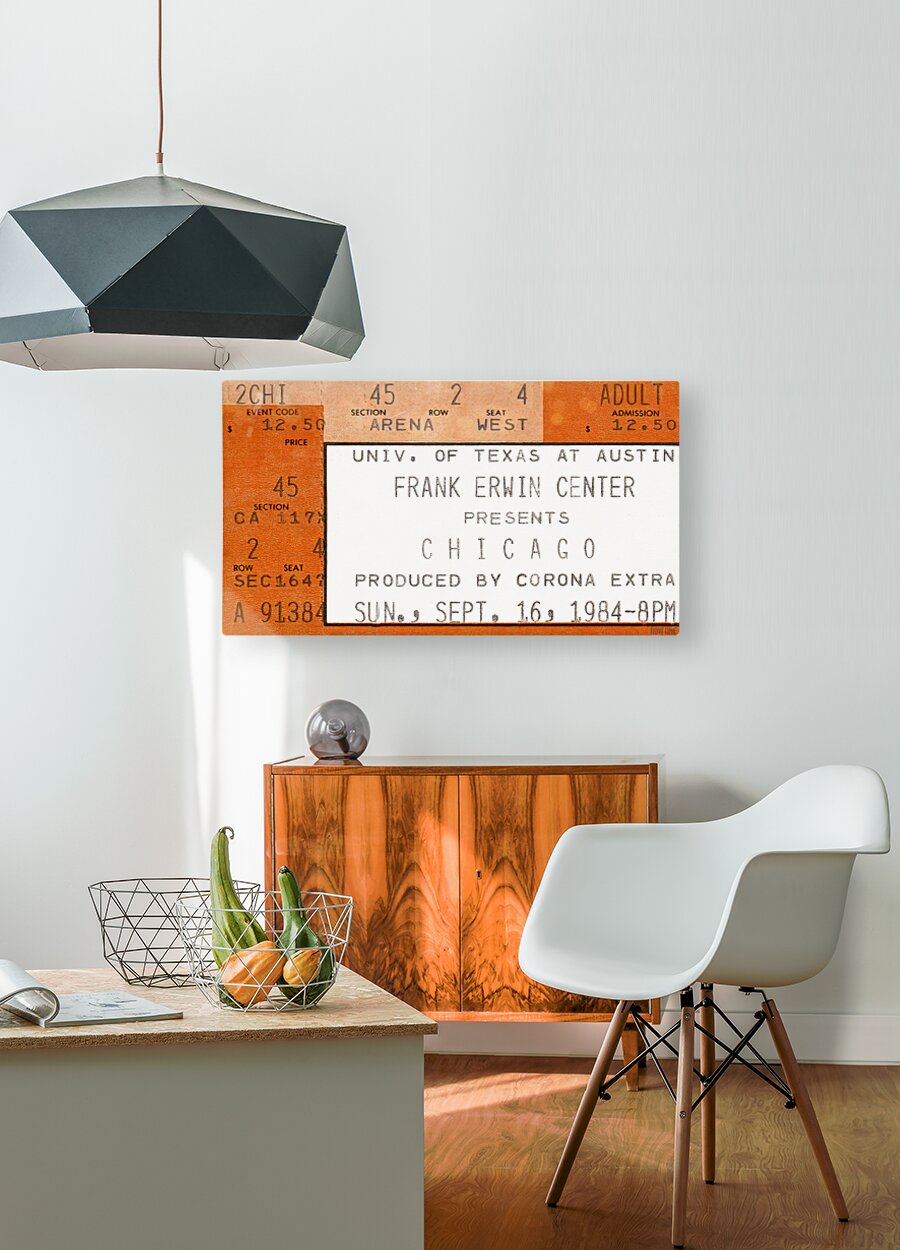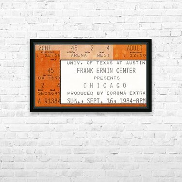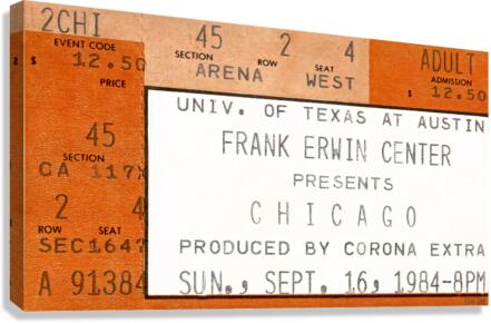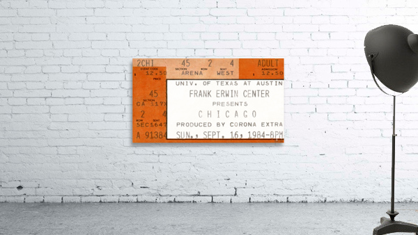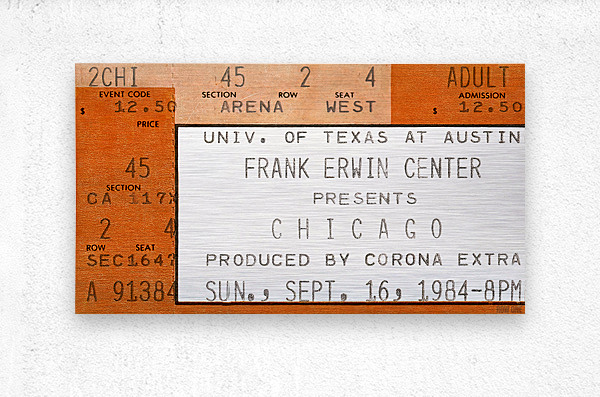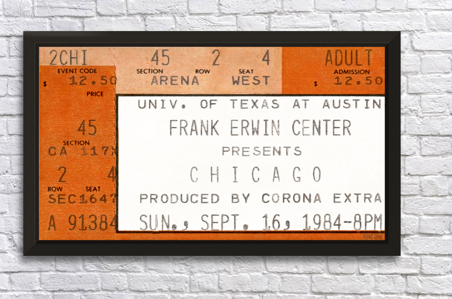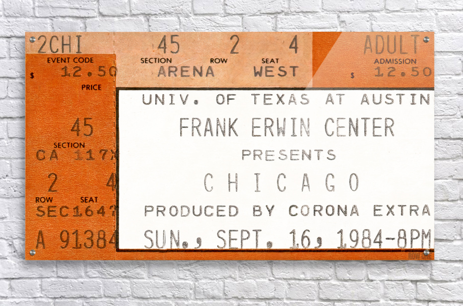 1984 Chicago Concert Ticket Stub Wall Art | Frank Erwin Center in Austin | Row One | 10,000 Historic Prints | Chicago, an American Pop Rock Band, was formed in 1968 and became one of the greatest bands in history. Created from a 1984 Chicago concert ticket stub to a September 16th concert at Frank Erwin Center in Austin, this '84 Chicago concert ticket stub art print will look fantastic in your game room or office. Derivative art © 2023 Row One Brand This historic concert ticket stub art print is not affiliated with, licensed, sponsored, authorized, or endorsed by any band, musician, artist, other brand, or any licensing entity. This ticket wall art print was created from a ticket published in 1984 without a copyright notice.