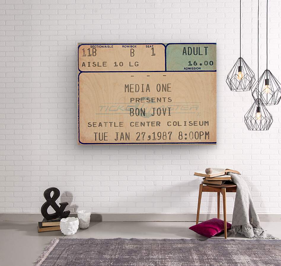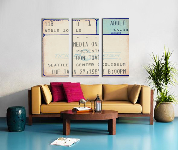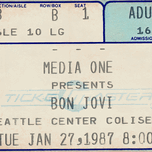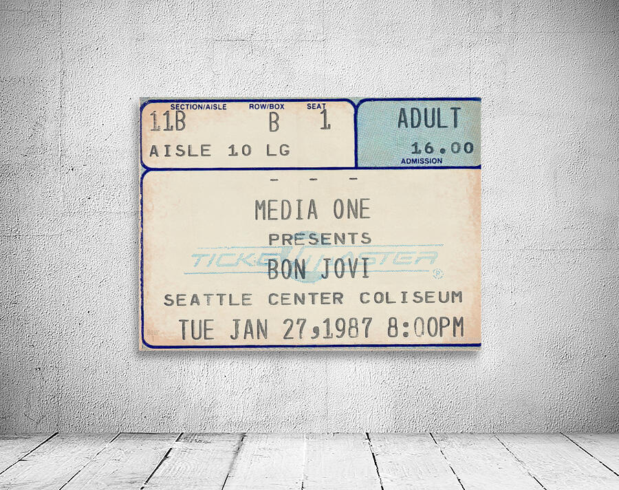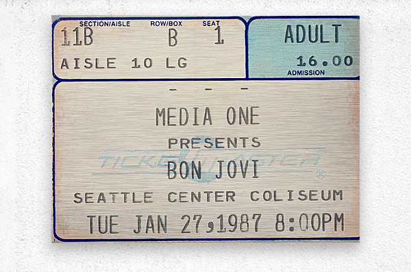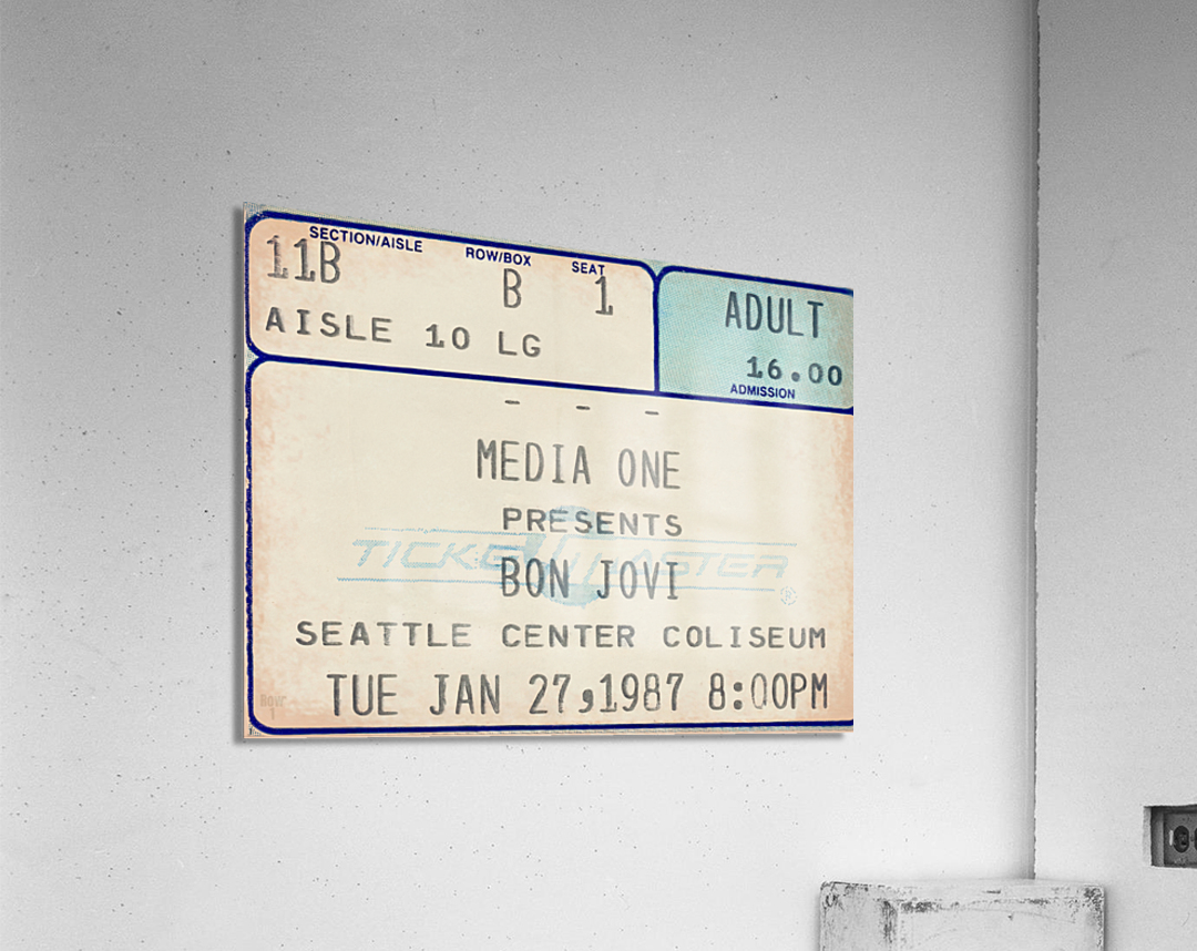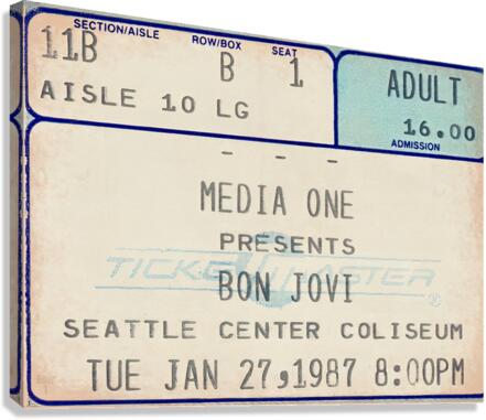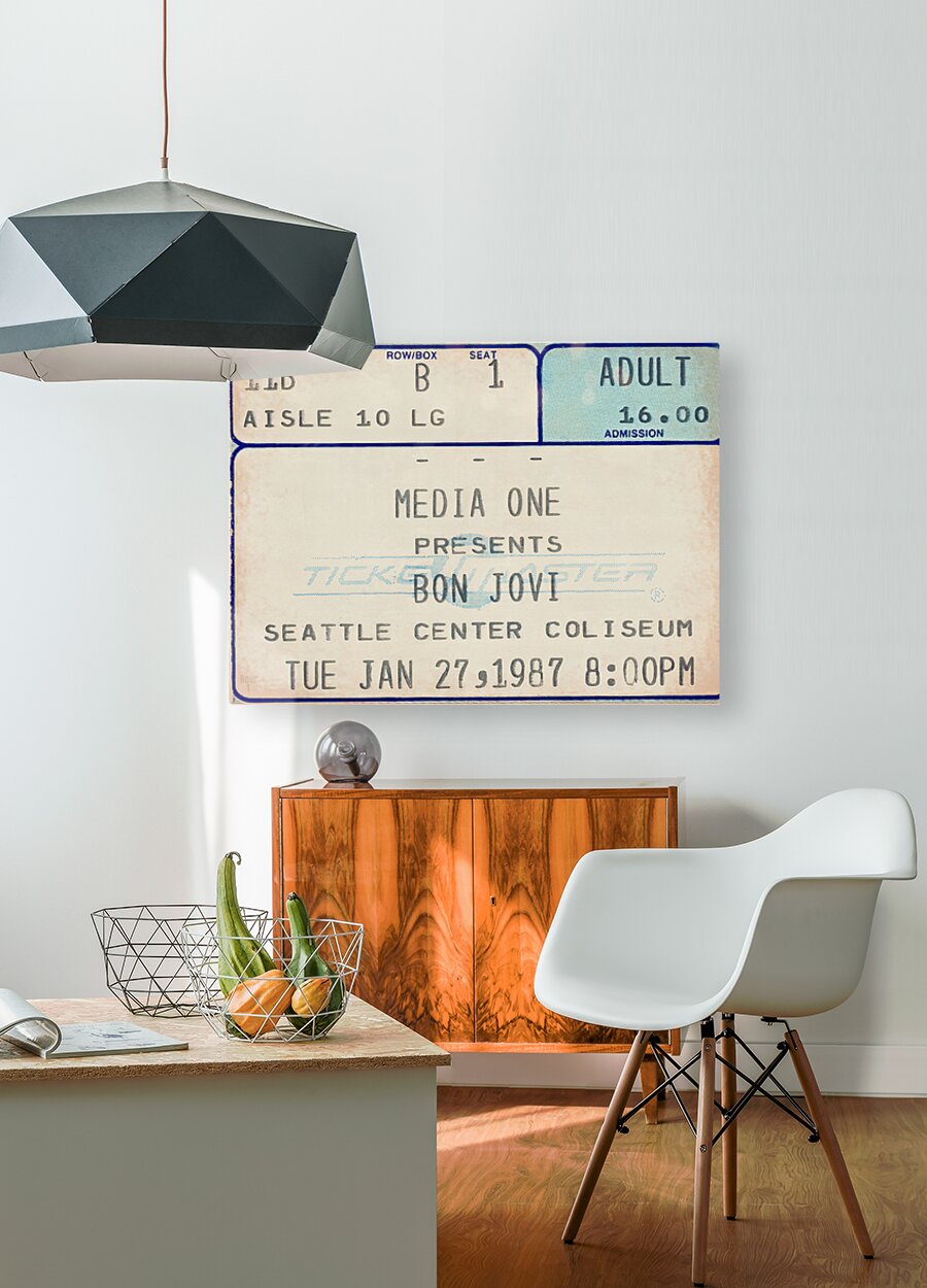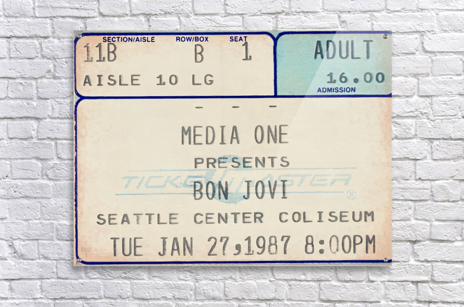 1987 Bon Jovi Concert Ticket Stub Wall Art | Row One | 10,000 Historic Prints | Created from a 1987 Bon Jovi concert ticket stub to a January 27th concert at the Seattle Center Coliseum, this '87 music concert ticket stub art print will look fantastic in your game room or office. Derivative art © 2023 Row One Brand This historic concert ticket stub art print is not affiliated with, licensed, sponsored, authorized, or endorsed by any band, musician, artist, other brand, or any licensing entity. This ticket wall art print was created from a ticket published in 1987 without a copyright notice.