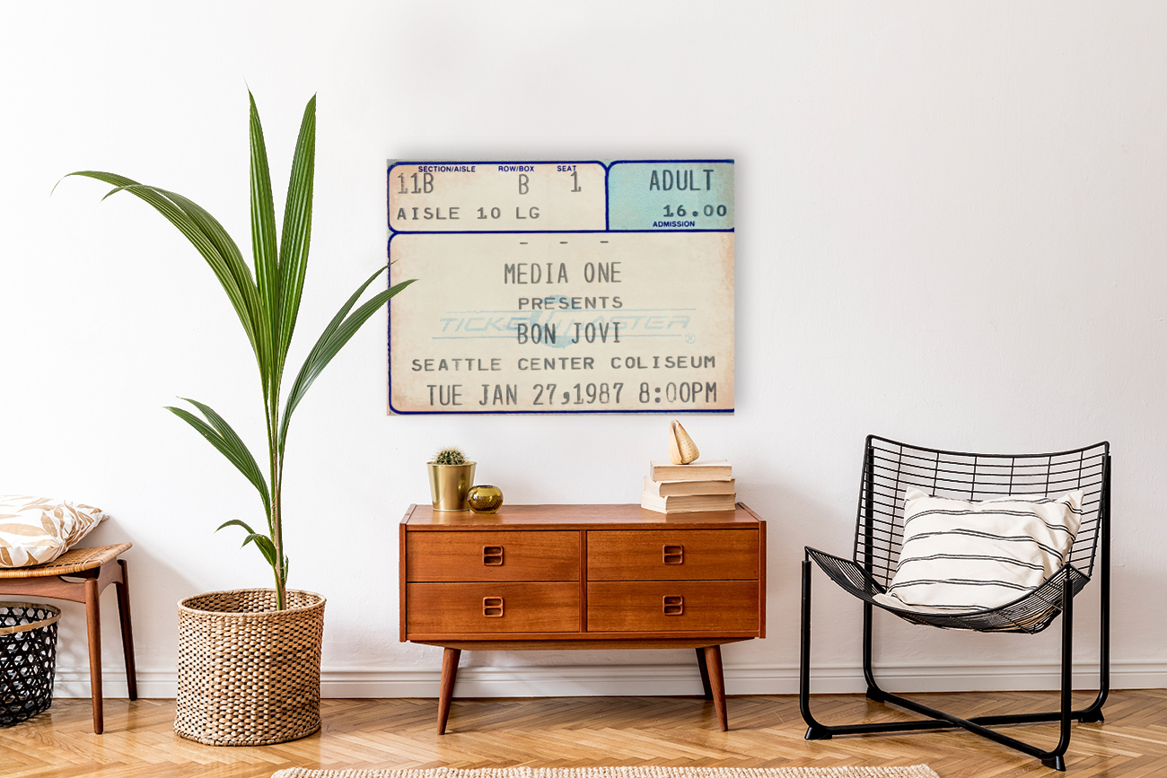 1987 Bon Jovi Concert Ticket Stub Wall Art | Row One | 10,000 Historic Prints | Created from a 1987 Bon Jovi concert ticket stub to a January 27th con...[+]