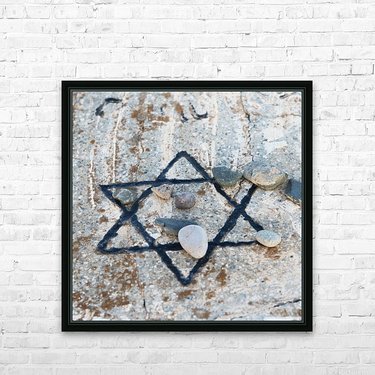 Get this artwork "A star of david etched and painted on a rock with stones laying on it" in a framed print.