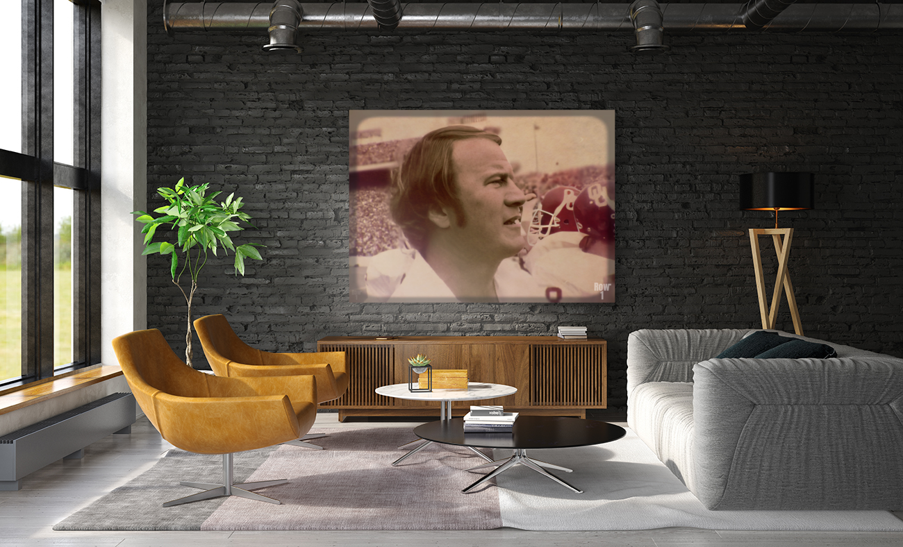 1977 Barry Switzer & Sooners | Row One | Over 10,000 Historic Sports Art Prints | Remixed for the aesthetics of a vintage viewfinder slide, Row One Brand's retro OU Sooners football viewfinder slide art will look great in your game room or office. Derivative art © 2023 Row One Brand This historic college football art print is not affiliated with, licensed, sponsored, authorized, or endorsed by any college, university, team, league, artist, athlete, coach, other brand, or any licensing entity.