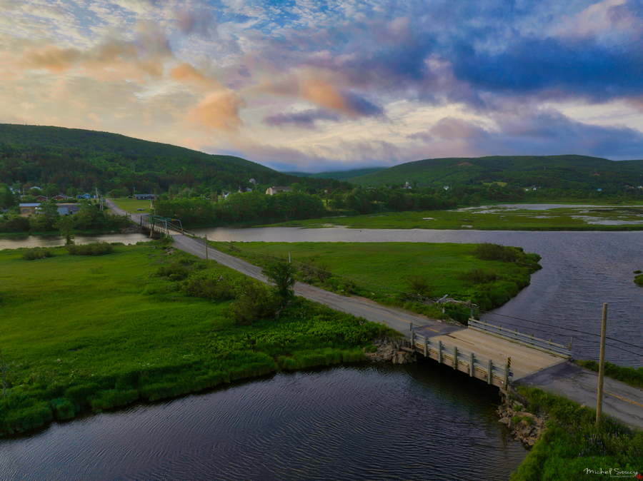 It's dawn at the Margaree East Crossing with the sun slowly making its way to to the top of the mountains. A low clouds ceiling has mixed in with a high sitting fog but still allowing the sun to send up some warm glows. It'll be a fine day in this part of Cape Breton Island, Nova Scotia and I'm loving every moment it has to offer. © Michel JS Soucy
