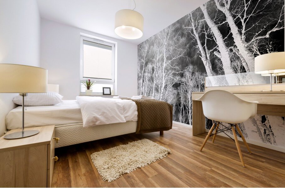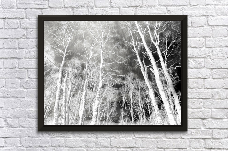 Originally a coloured digital photograph of snow covered Birch tree trunks in the Scottish Highlands, laterally digitally manipulated to create a dramatic winter forest scene.