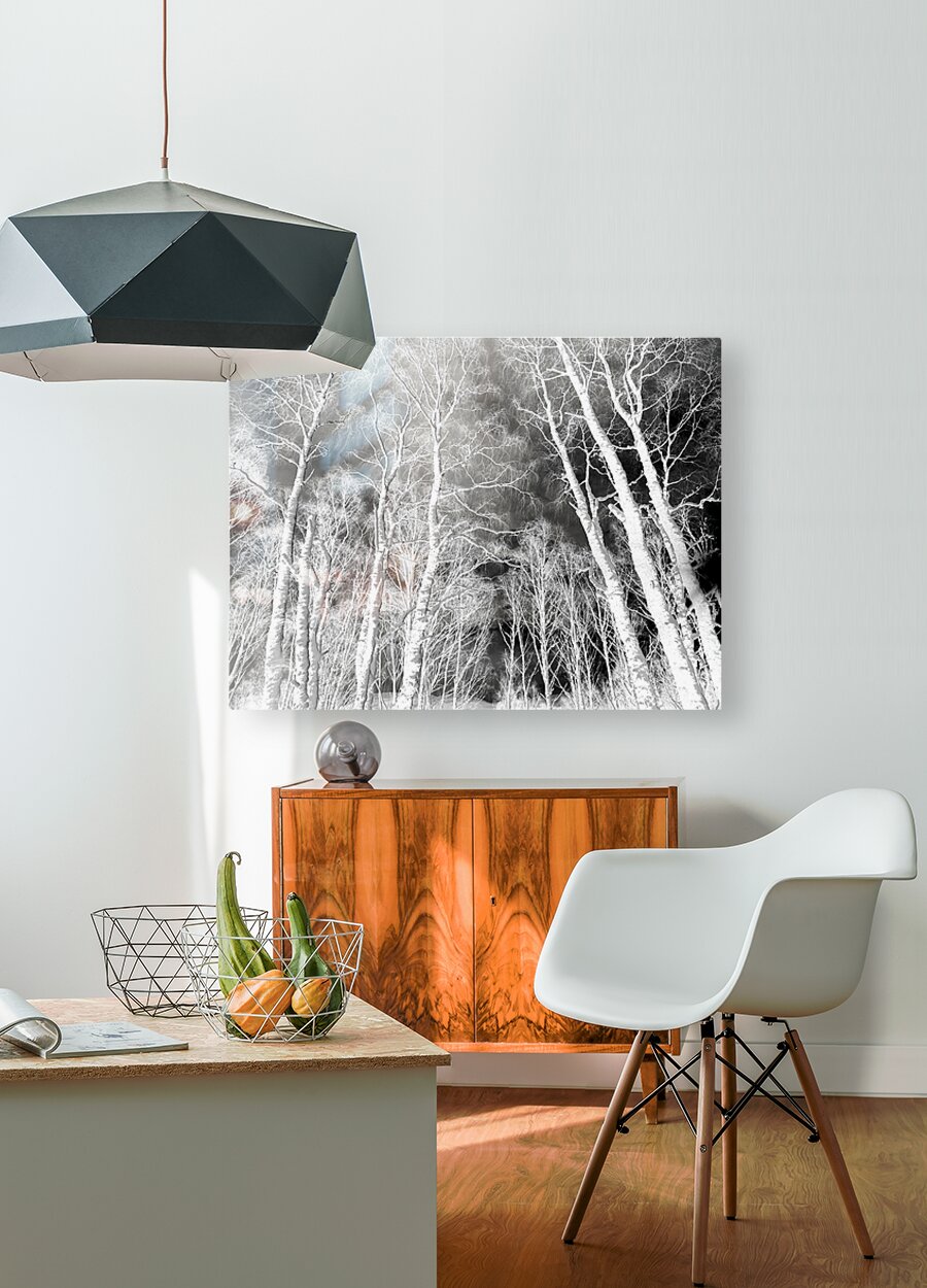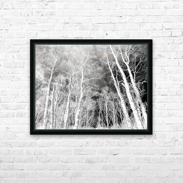 Originally a coloured digital photograph of snow covered Birch tree trunks in the Scottish Highlands, laterally digitally manipulated to create a dram...[+]
