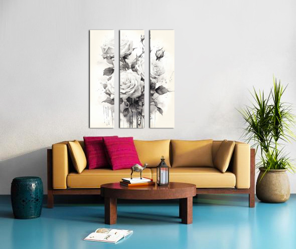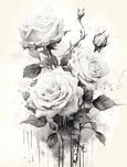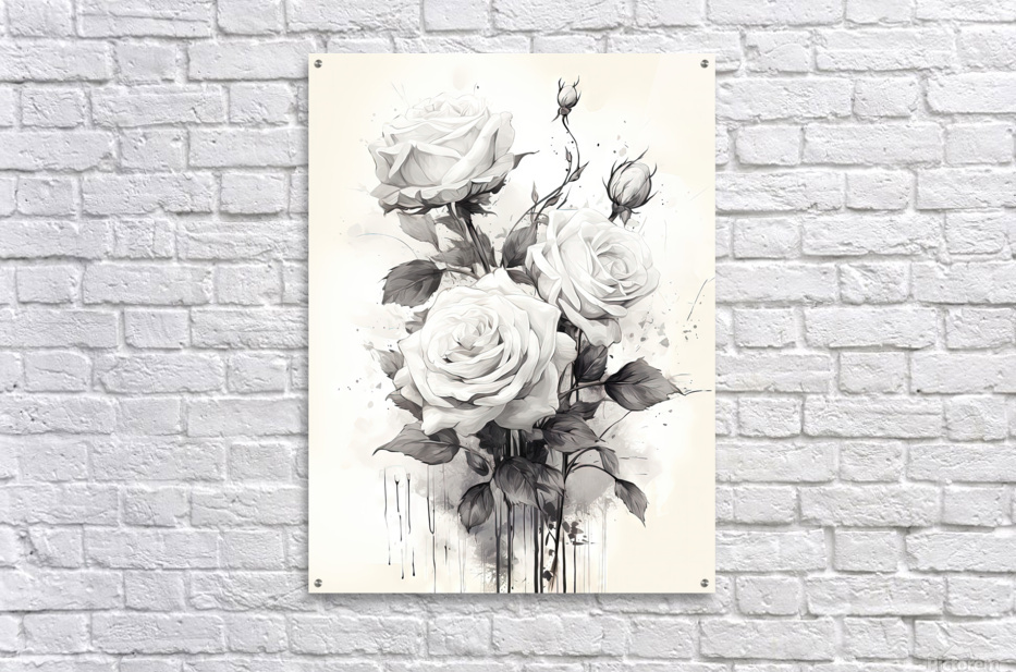 This is part of a series: Rose in Perpetuity. A series where the delicate and fleeting beauty of roses meets the fluidity of acrylic and water. This piece showcases a bouquet of roses in only two stages of flowering in a monochrome palette with a nod to watercolors. Bold and vibrant.