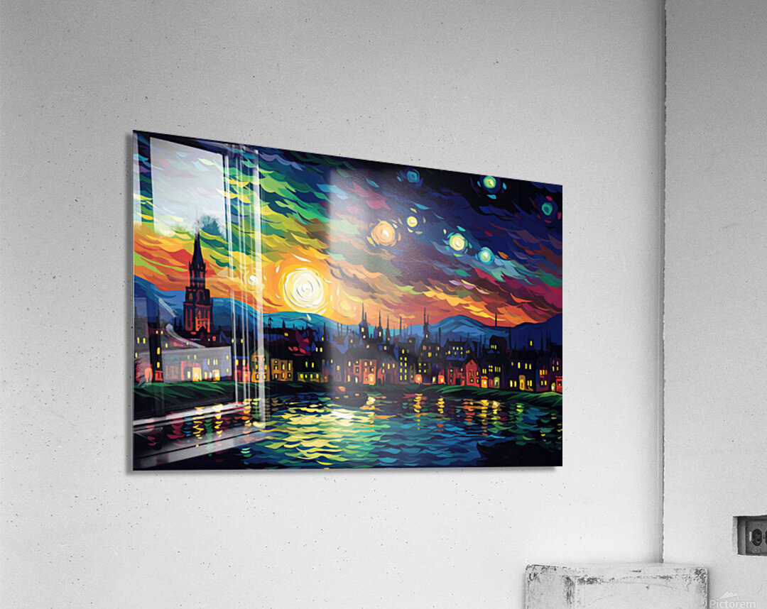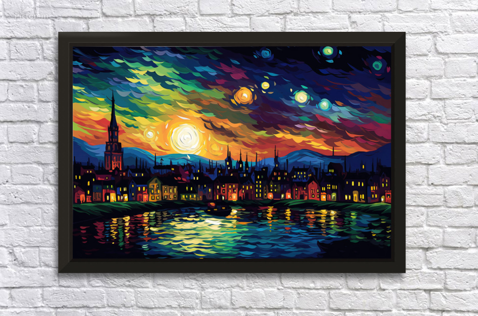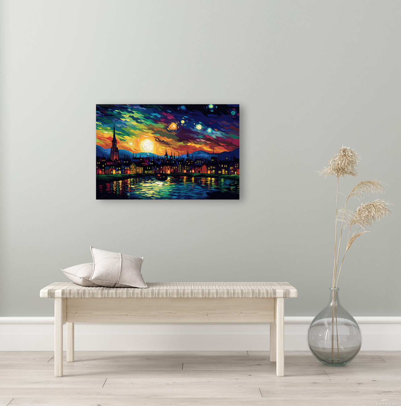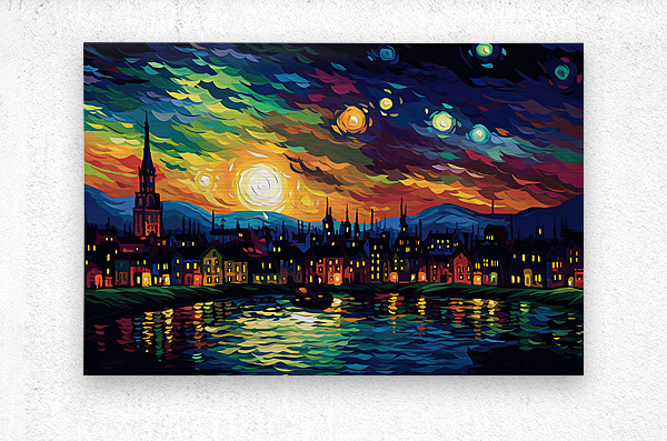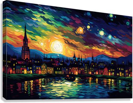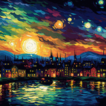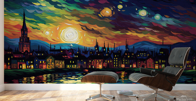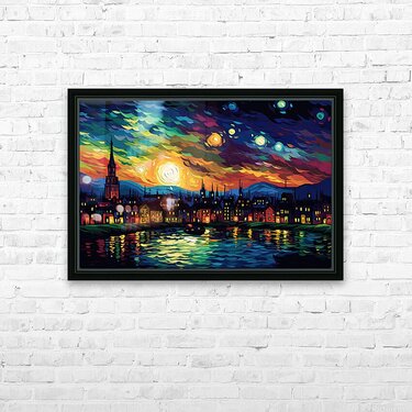 This is a modern interpretation of Vincent van Gogh's "Starry Night." It combines elements of a contemporary cityscape with the artful style of V...[+]