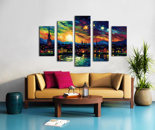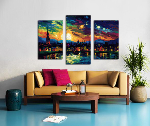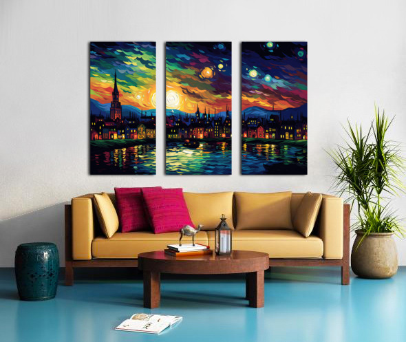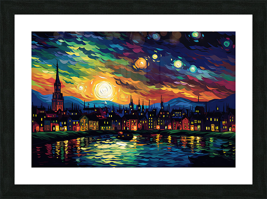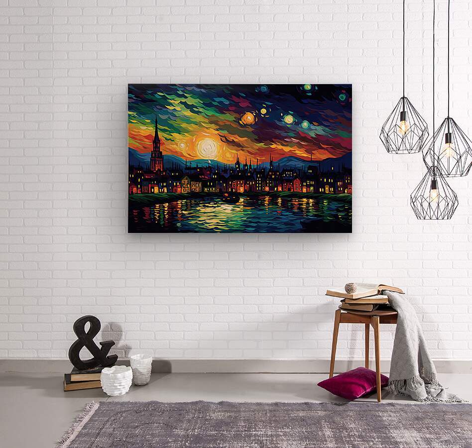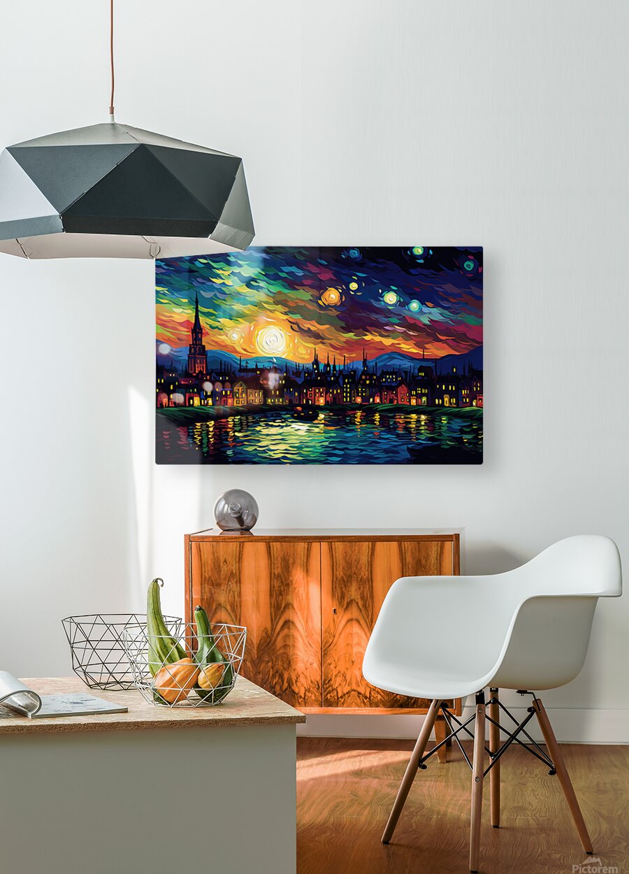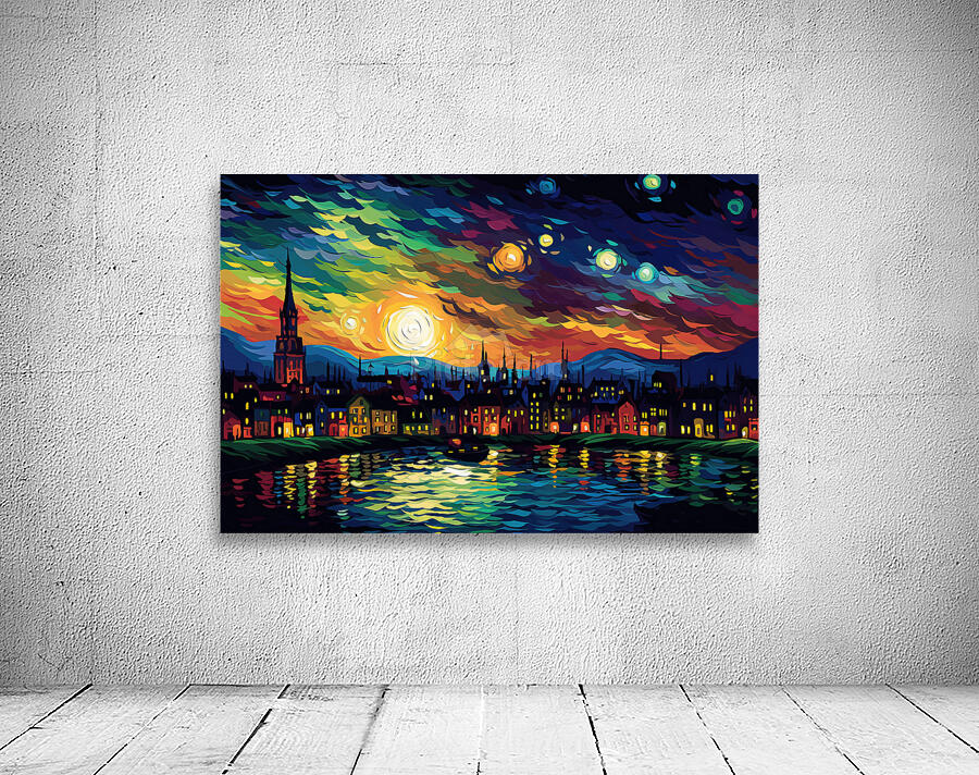 This is a modern interpretation of Vincent van Gogh's "Starry Night." It combines elements of a contemporary cityscape with the artful style of V...[+]