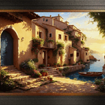 Get this artwork "A Seaside Village In The Morning Sun Serene AI Concept Art by Xzendor7" in a framed print.